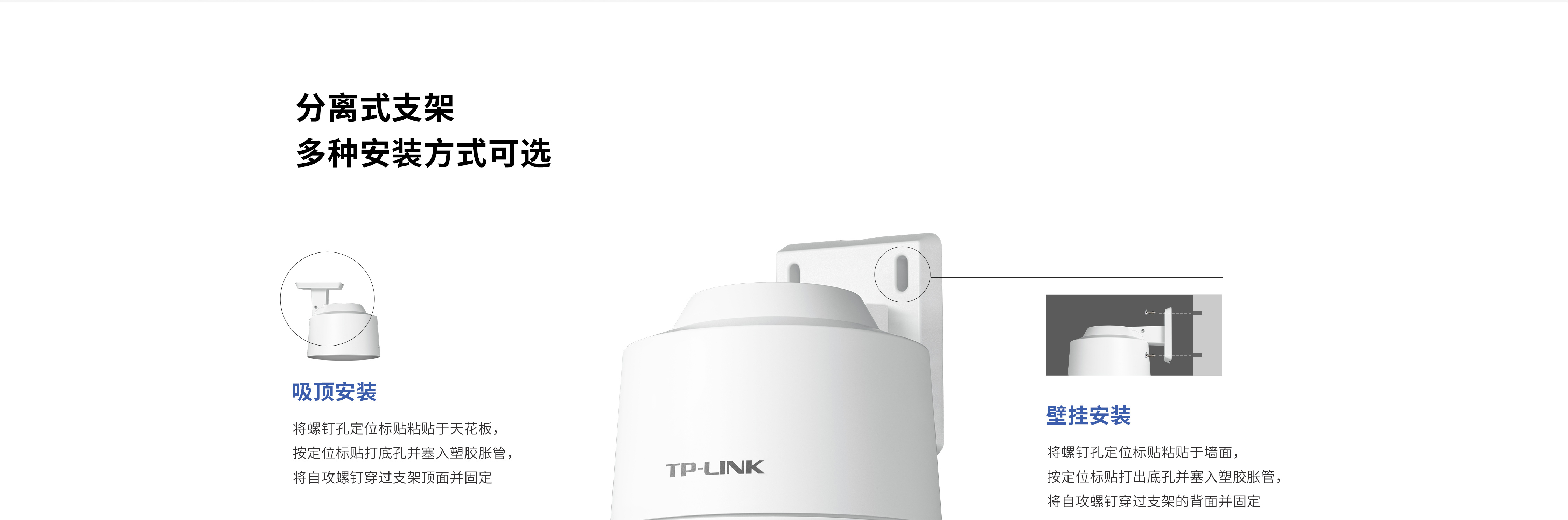 自带分离式支架,支持抱杆/吸顶/壁挂安装