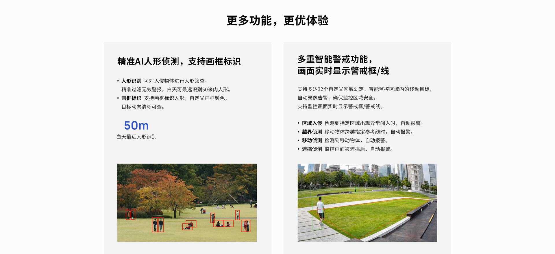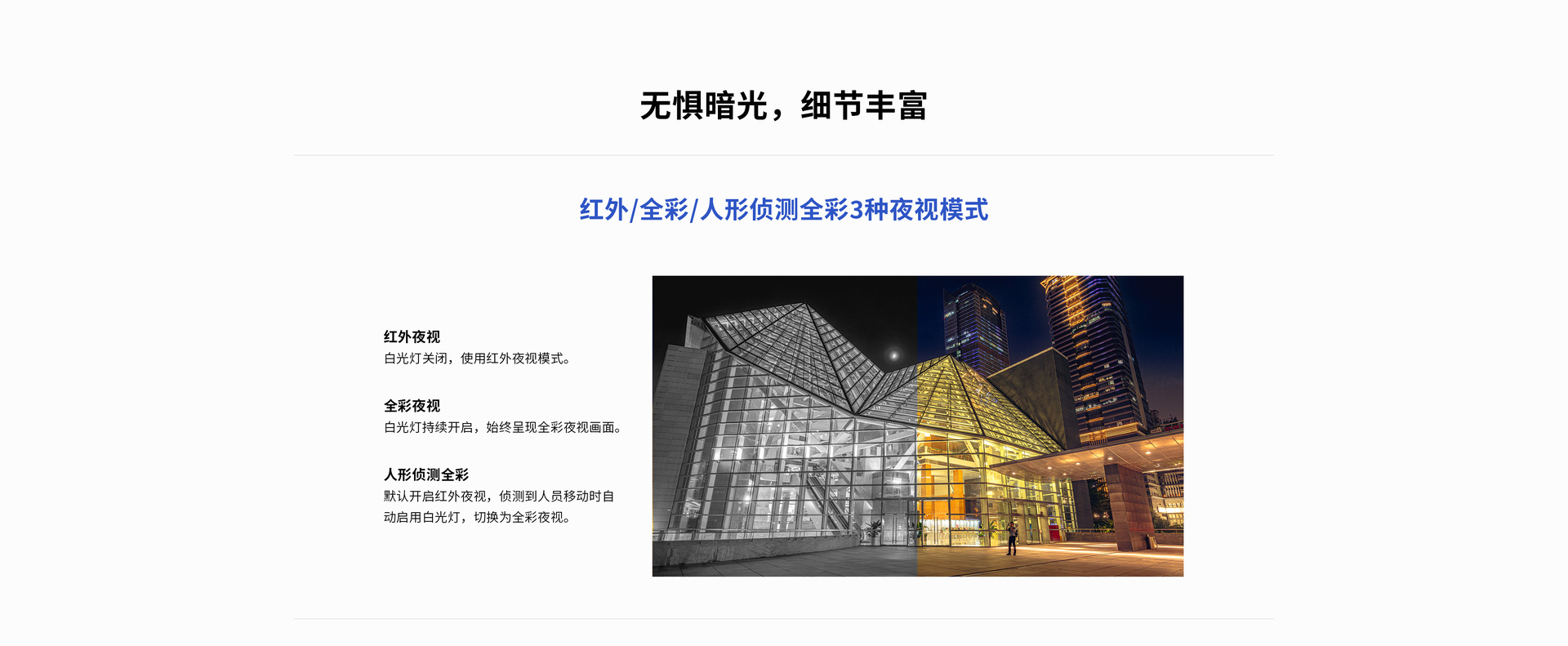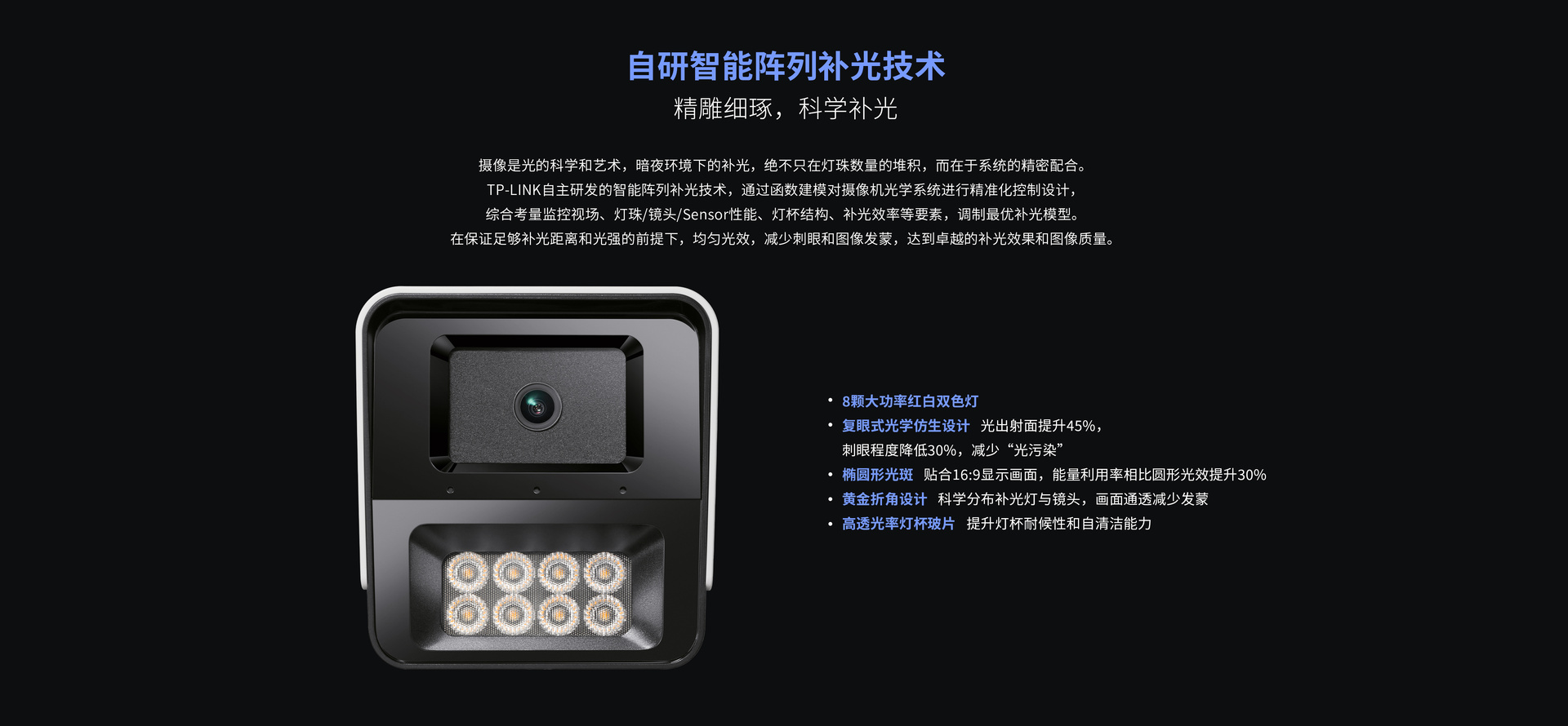 补光方案全新设计,外置8颗大功率双色灯、支持全彩/红外/移动侦测全彩