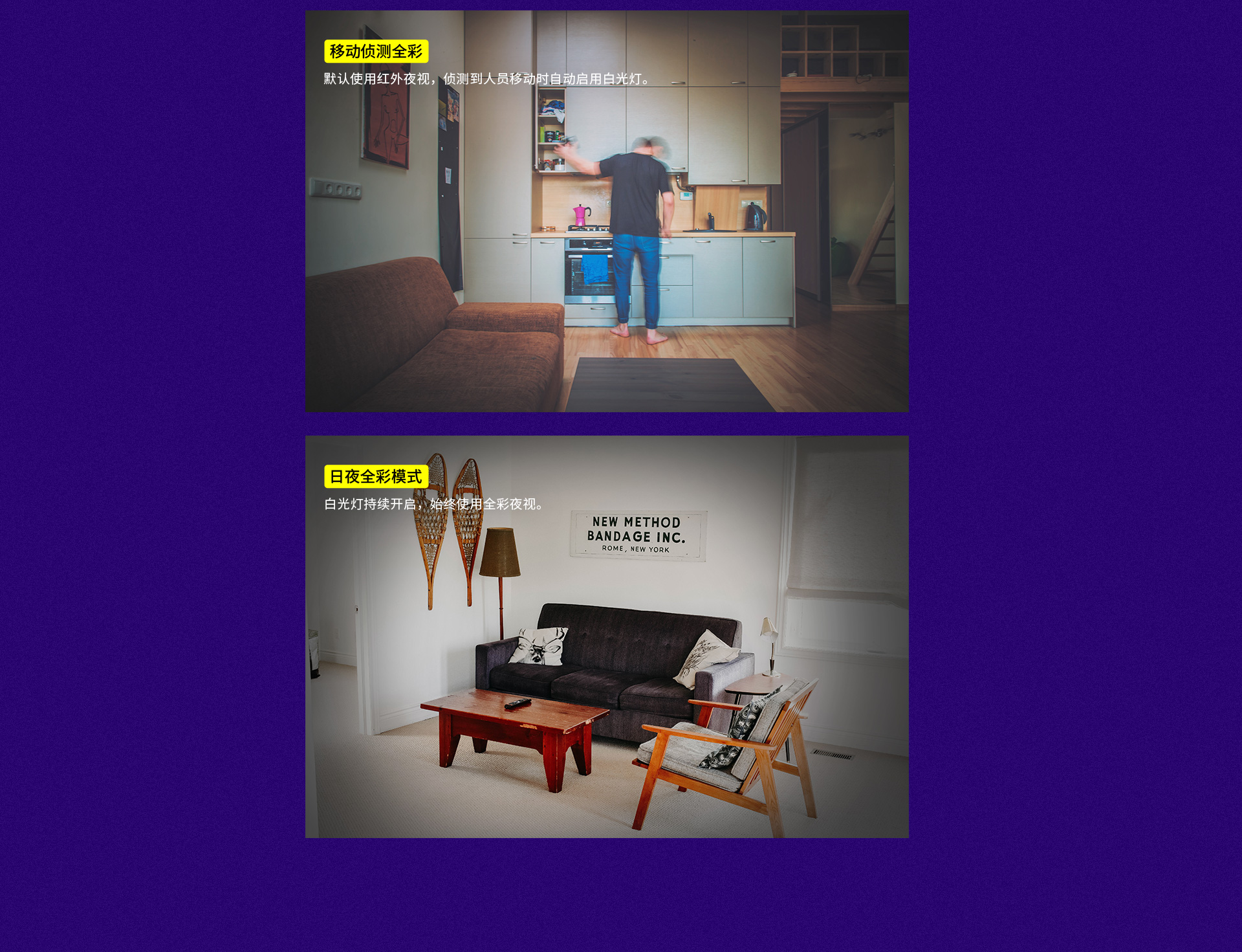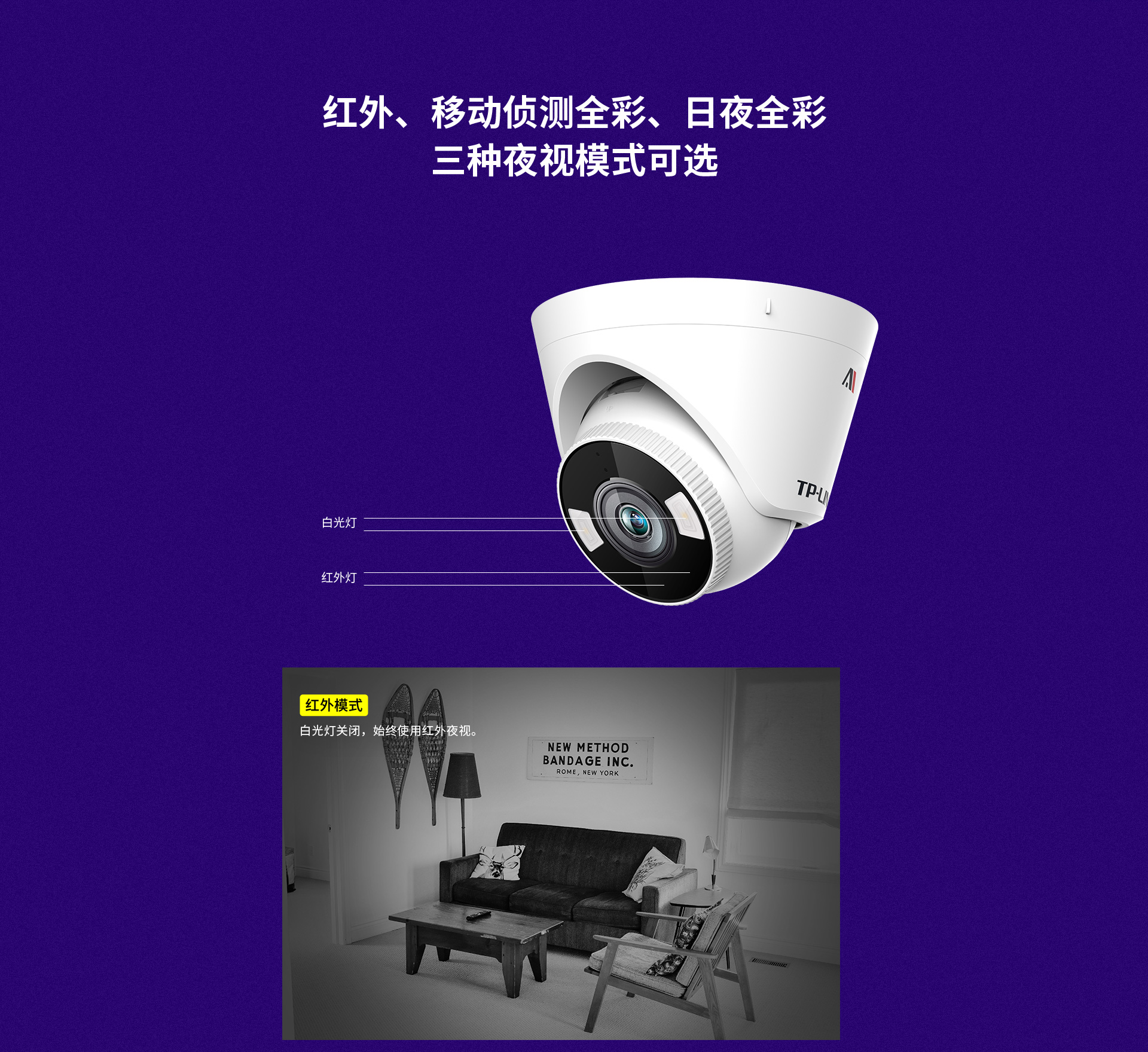 外置2颗暖光灯、2颗红外灯,支持全彩/红外/移动侦测全彩