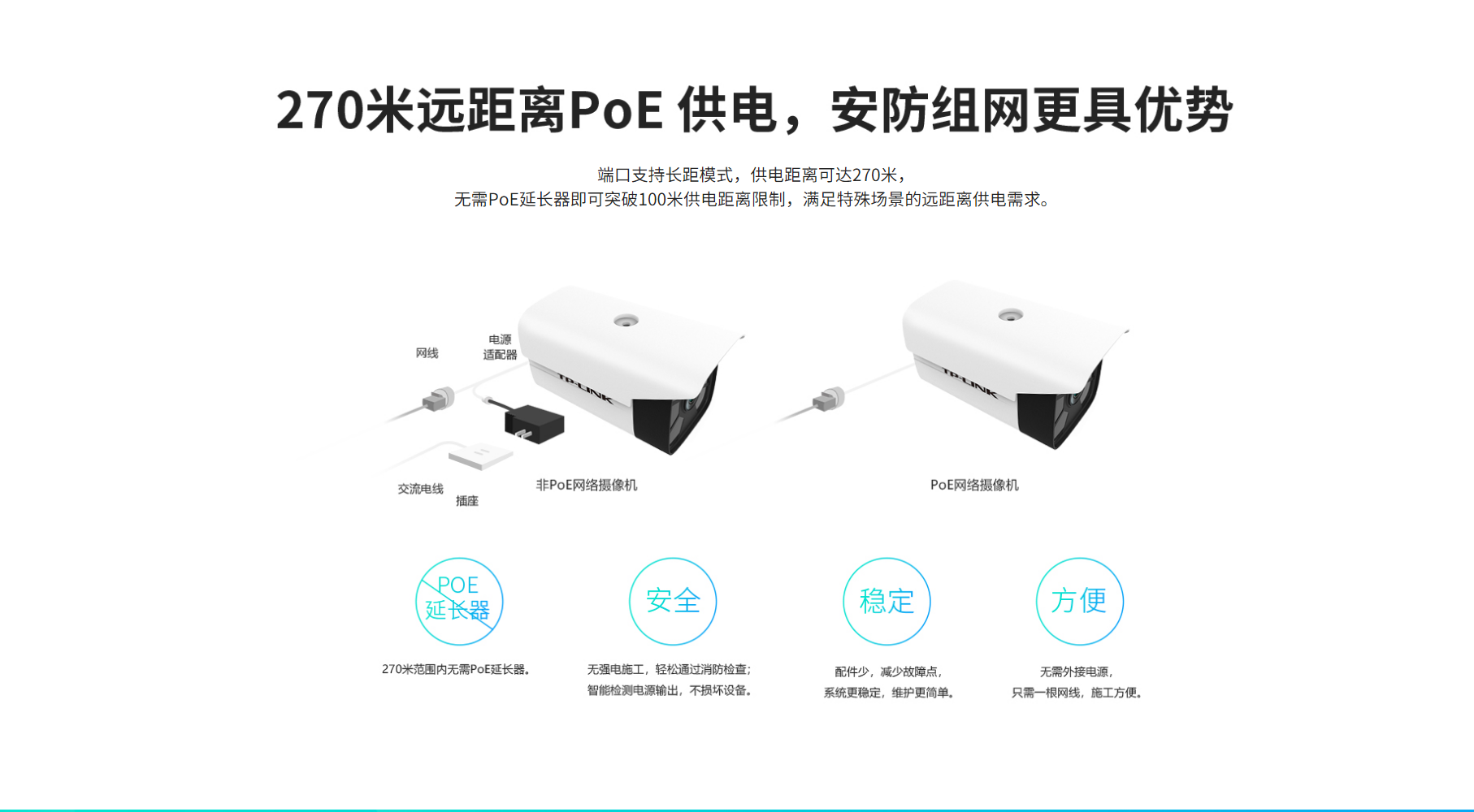 支持270米远距离PoE供电,无需交换机,安全布线更方便