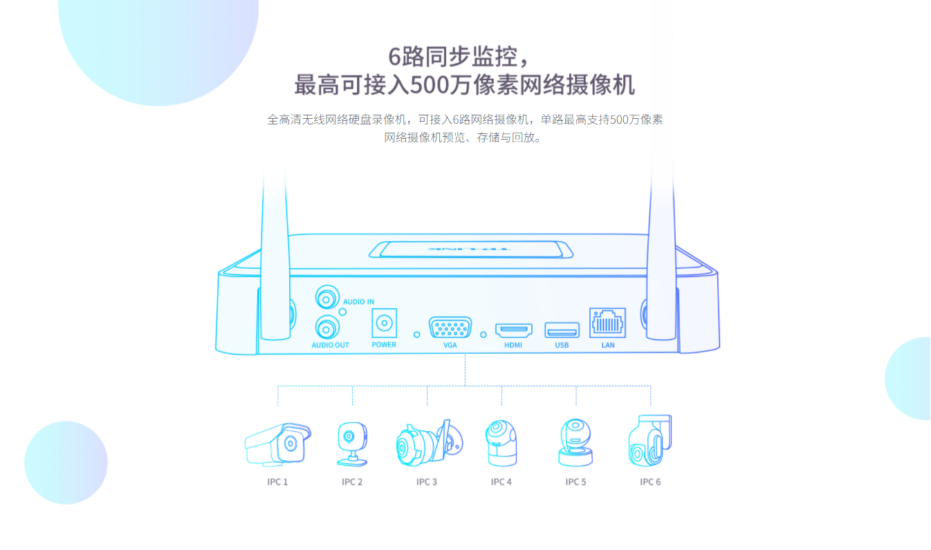 6路同步监控,最高可接入500万像素摄像机
