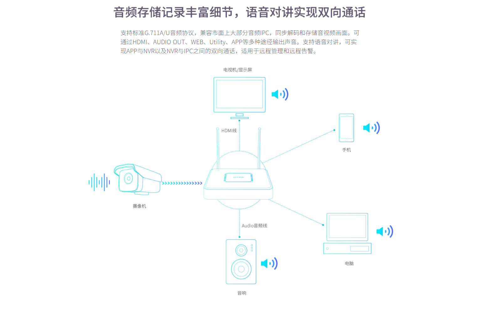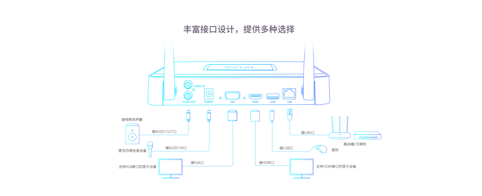 支持HDMI、VGA视频接口,支持音频输入输出