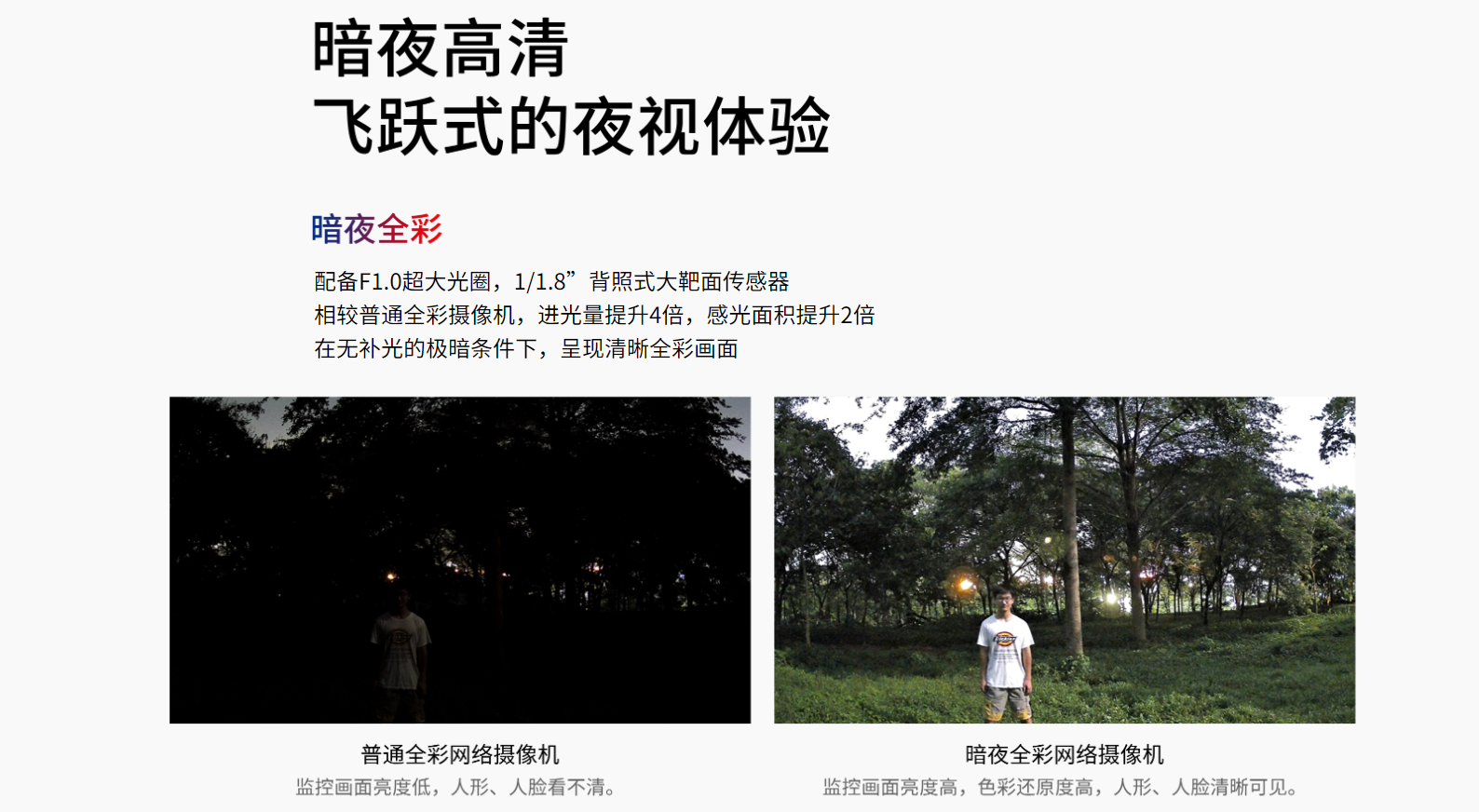 采用1/1.8''黑光级图像传感器、F1.0大光圈镜头,极低照度下依然保持彩色画面