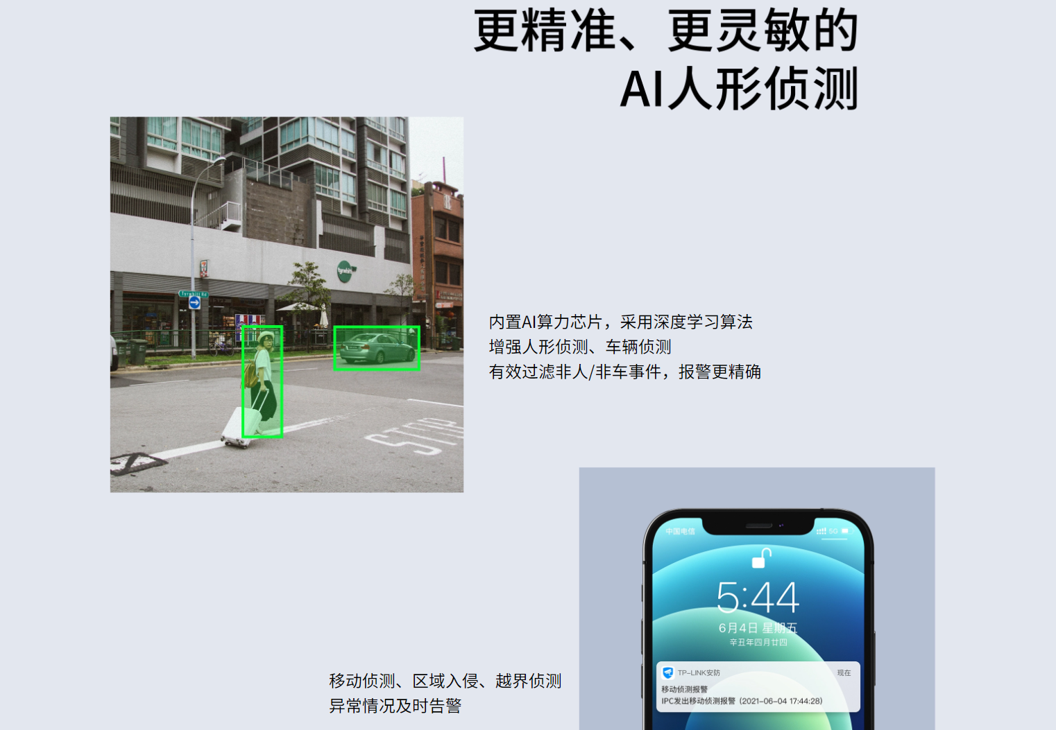 支持移动侦测、遮挡侦测、人形侦测、车辆侦测