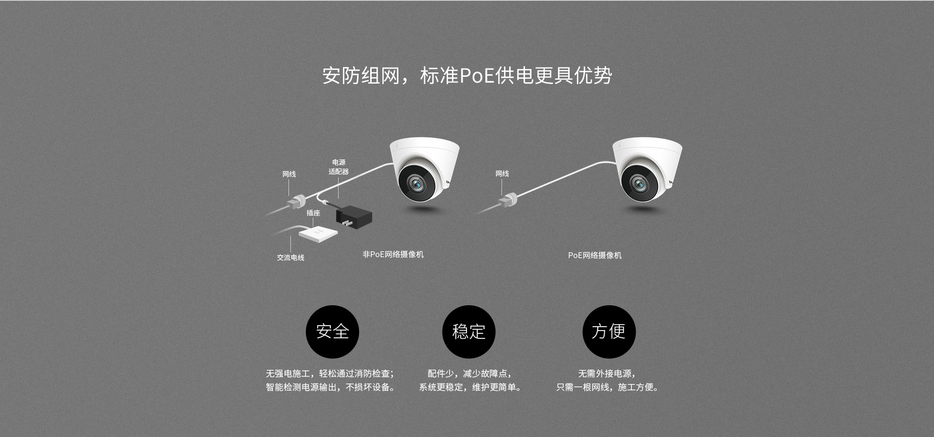 支持IEEE 802.3af/at 标准PoE供电,稳定安全,施工方便
