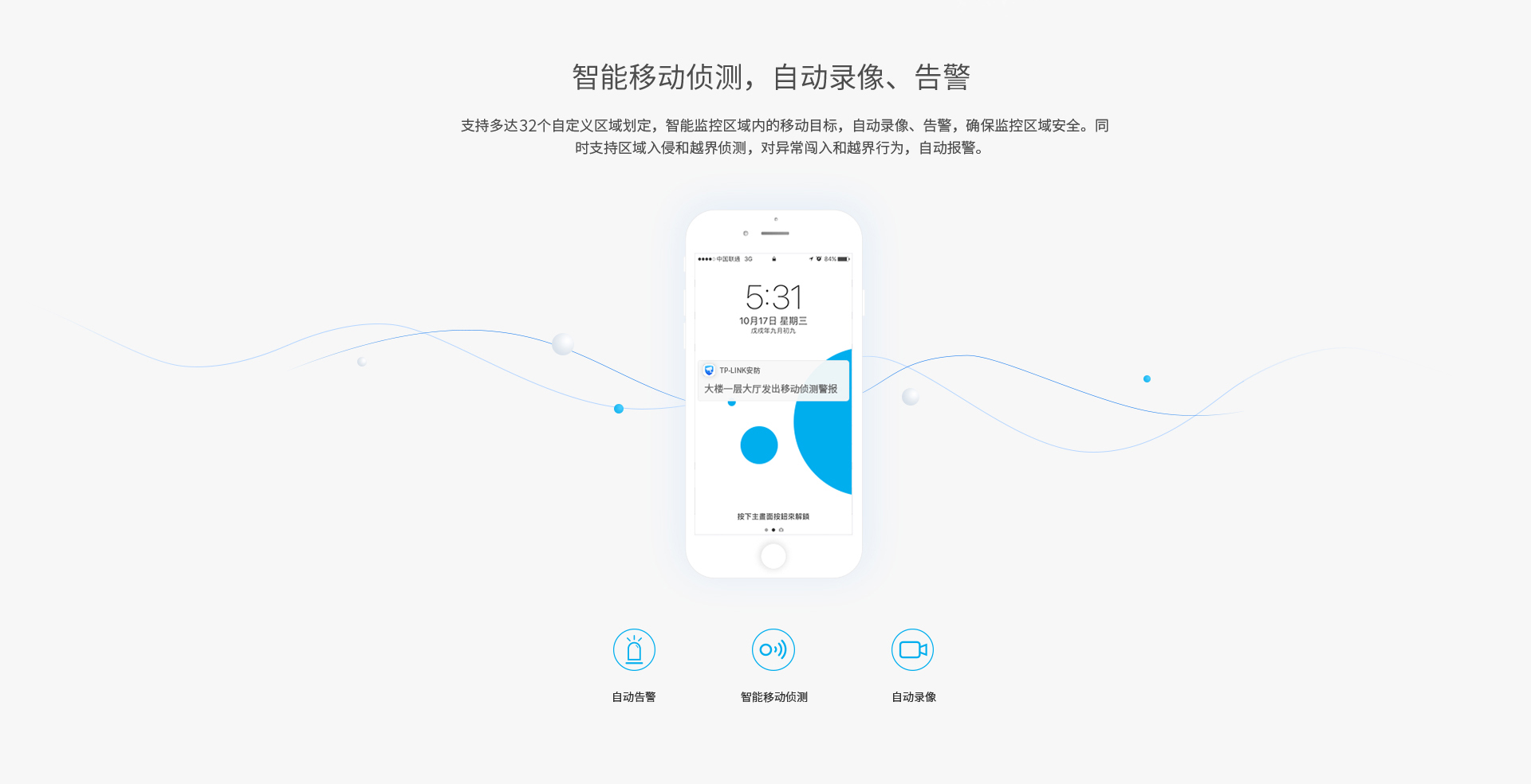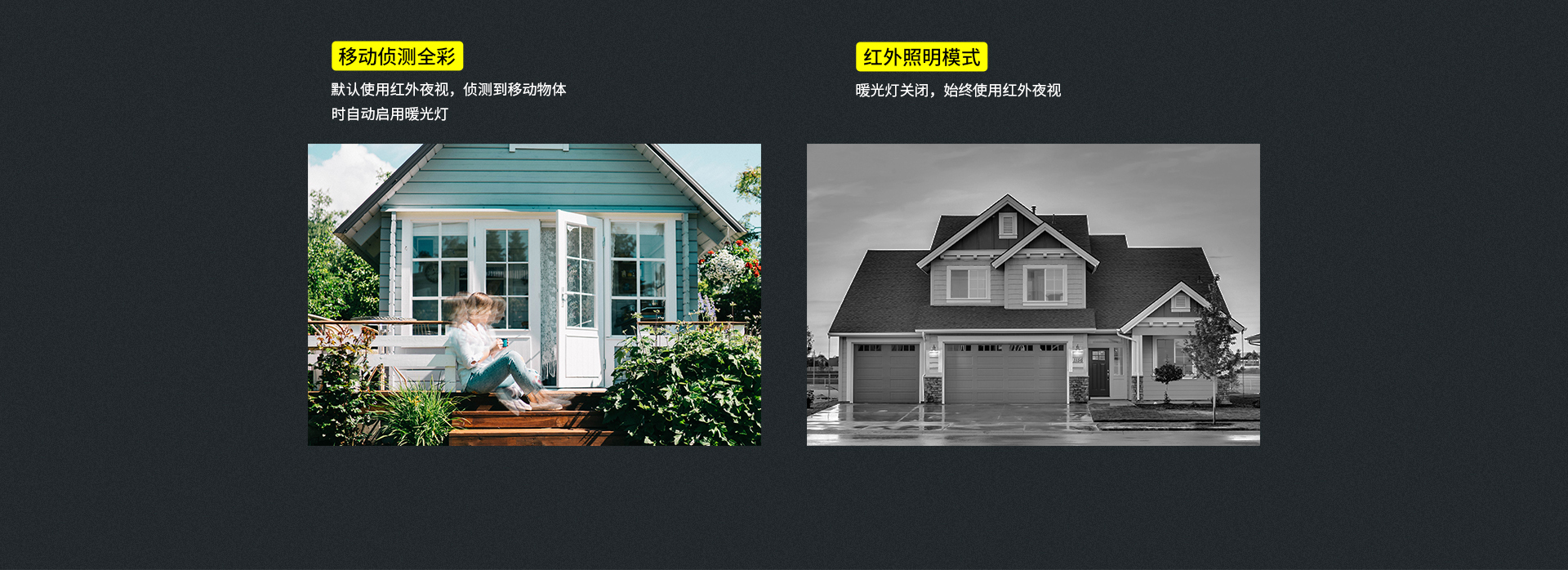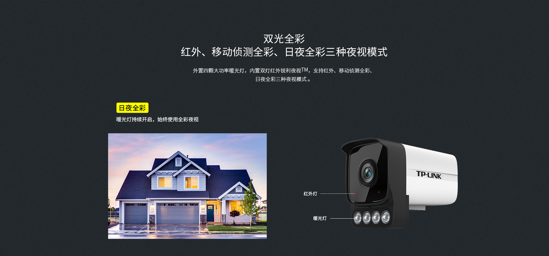 外置4颗暖光灯、内置2颗红外灯,支持全彩/红外/移动侦测全彩