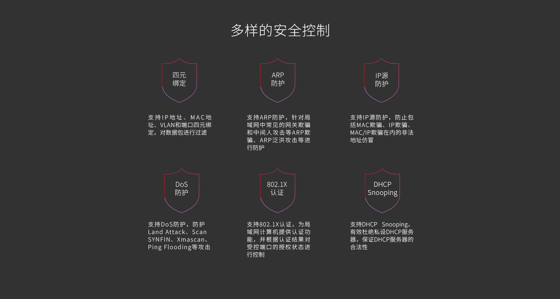 支持四元绑定、ARP/IP/DoS防护、802.1X认证