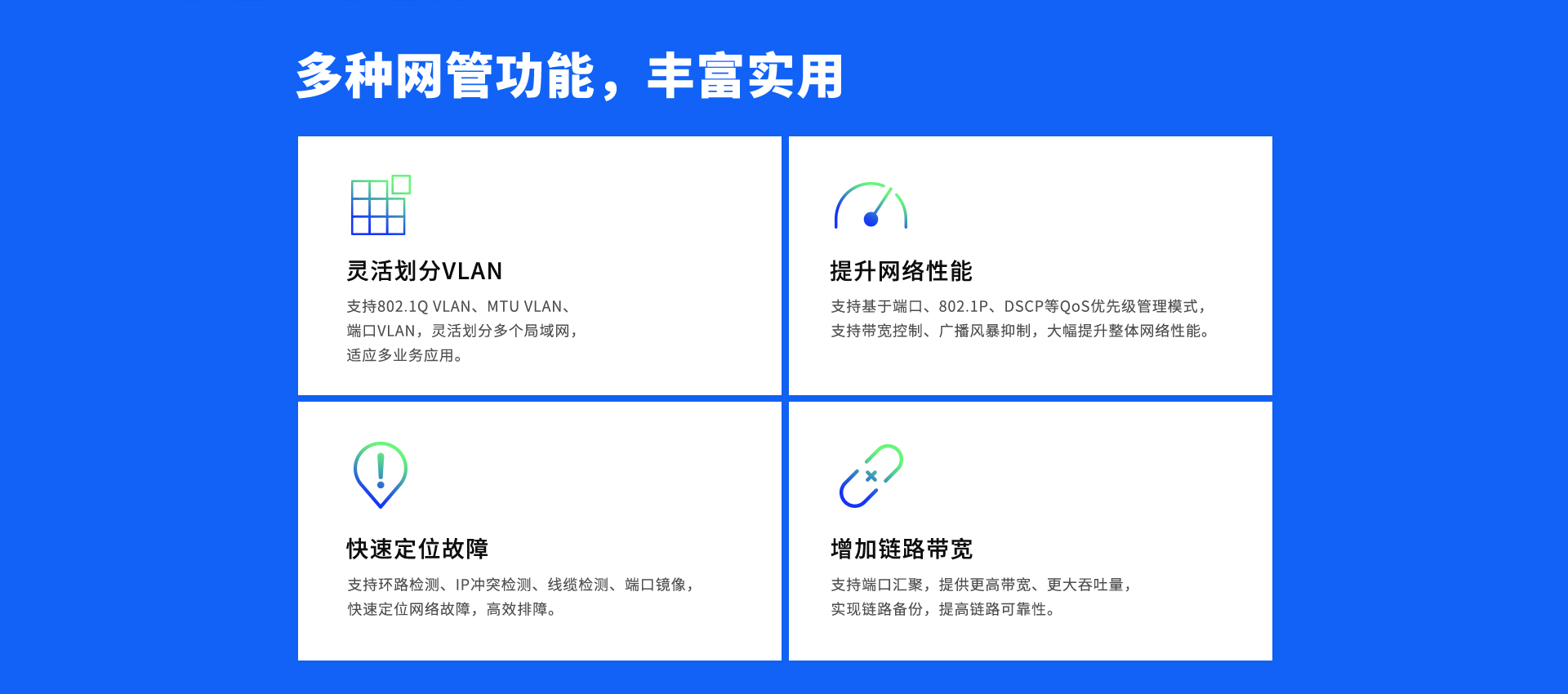 支持802.1Q VLAN、Port VLAN、QoS、带宽控制、风暴抑制