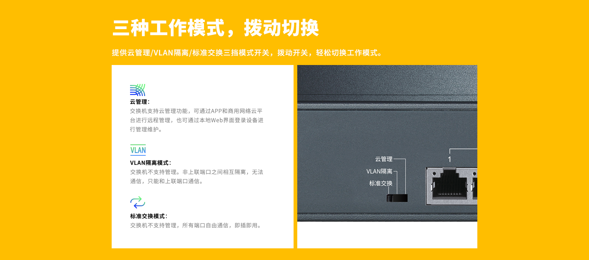 支持云管理、VLAN隔离、标准交换三种工作模式