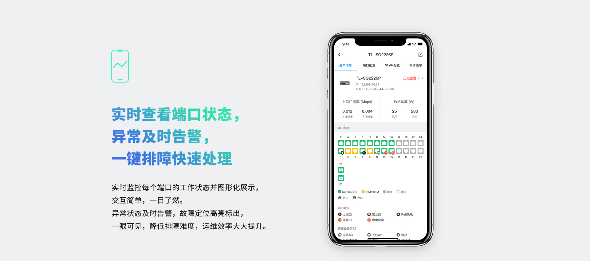 支持端口汇聚、端口流量统计、端口监控、线缆检测、环回保护