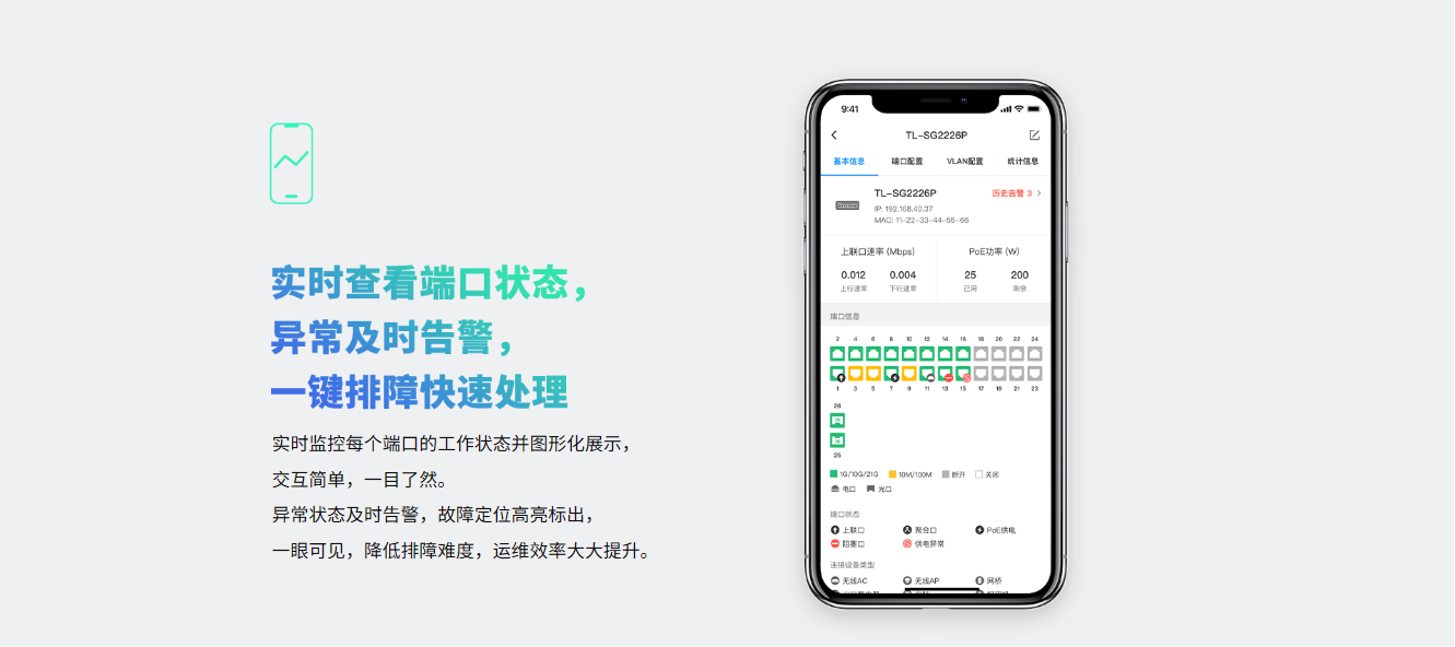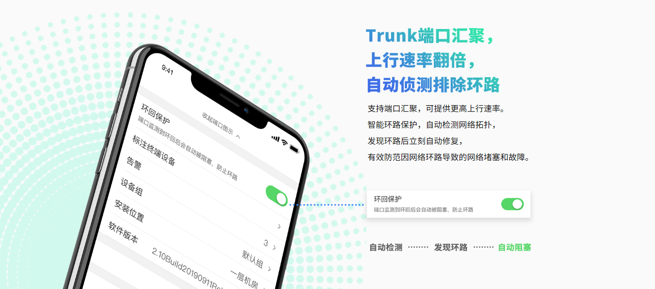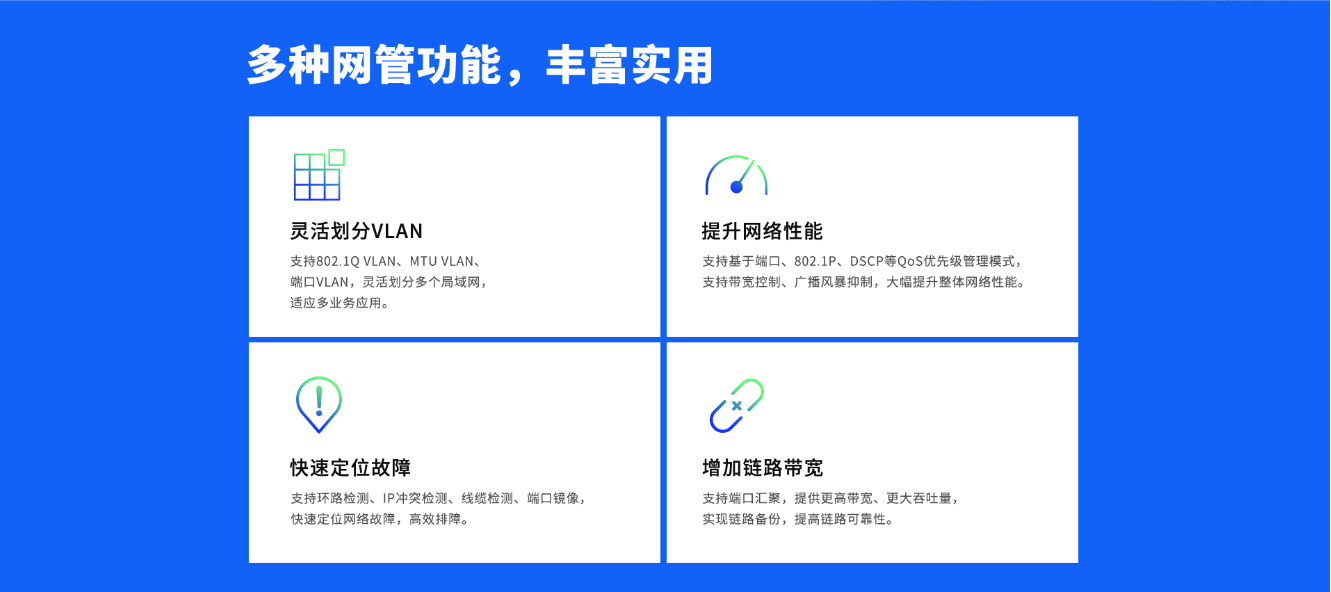 支持端口汇聚、端口流量统计、端口监控、线缆检测、环回保护