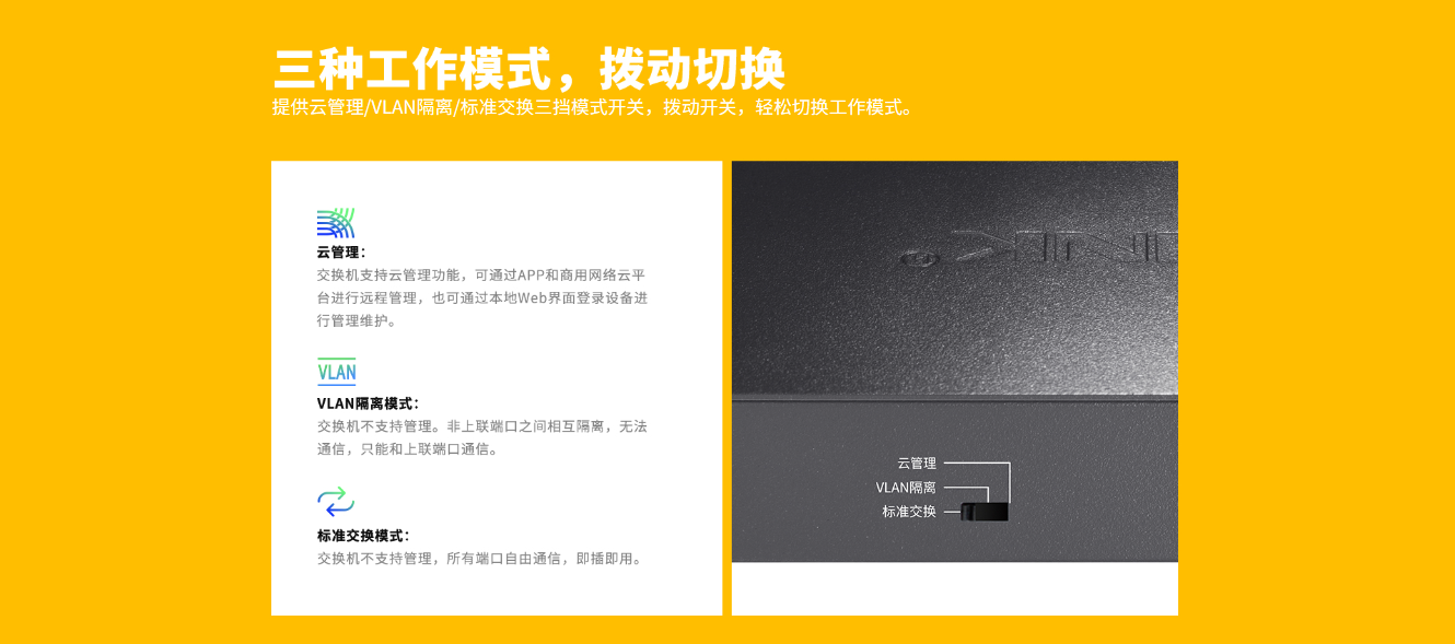 支持云管理、VLAN隔离、标准交换三种工作模式