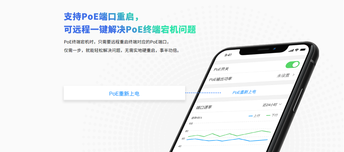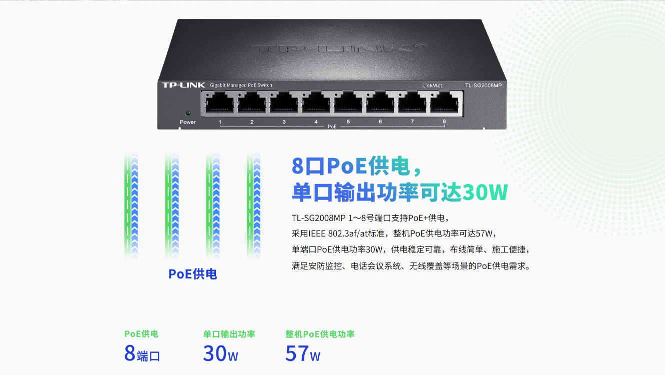 整机最大PoE供电功率为57W,单端口最大PoE供电功率为30W