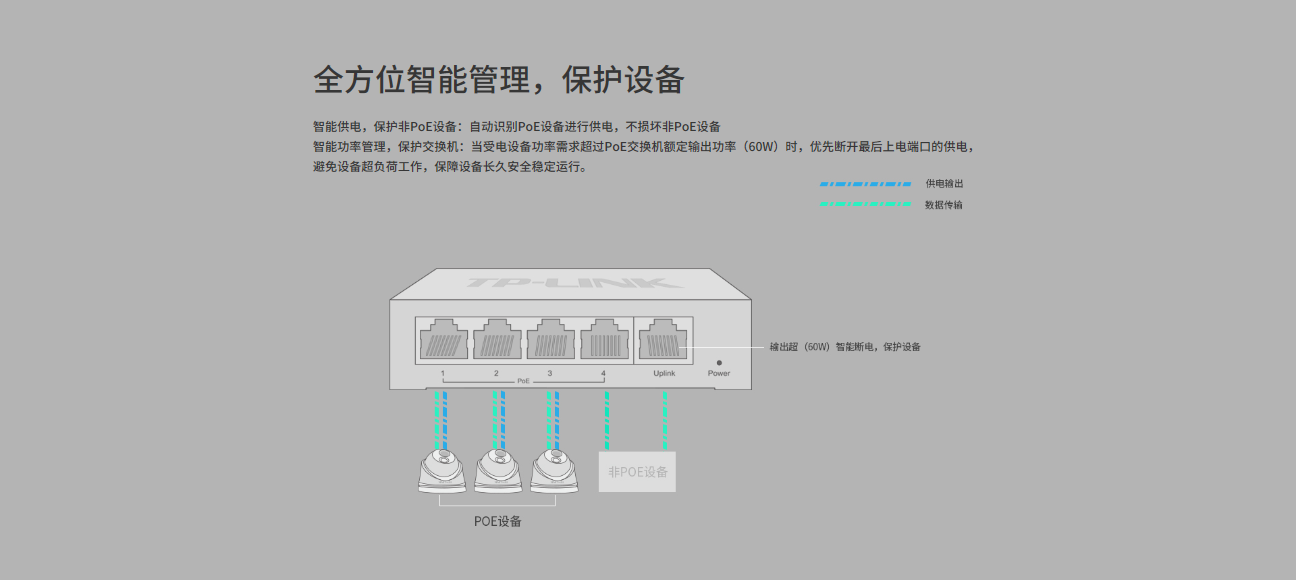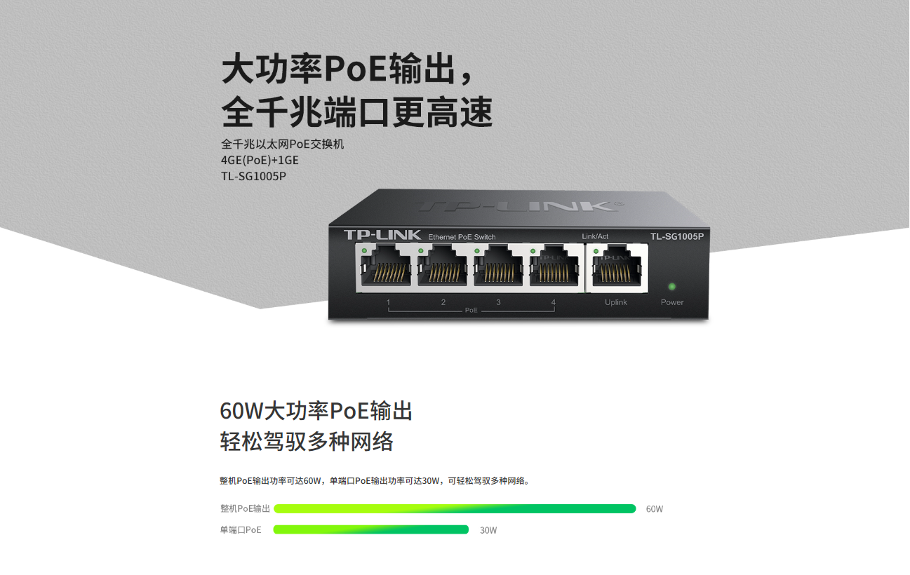 单端口POE功率可达30W,整机最大PoE输出功率为60W