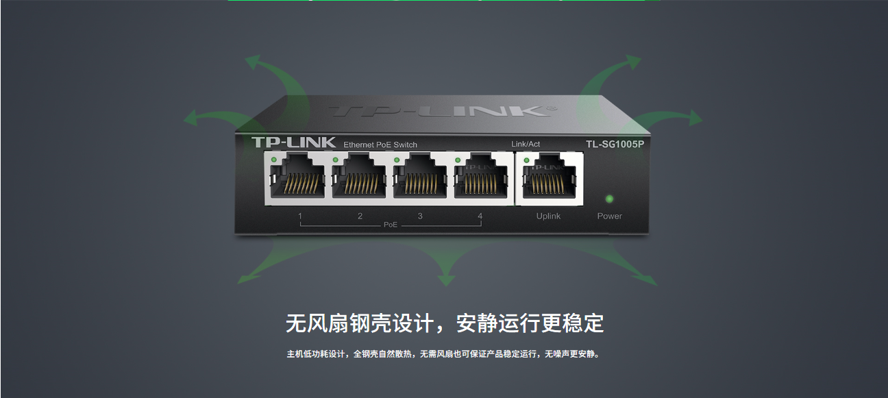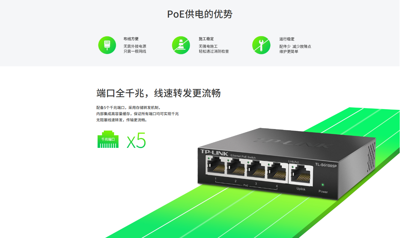 5个10/100/1000M 自适应RJ45端口,1~4号端口支持IEEE 802.3af/at标准PoE供电