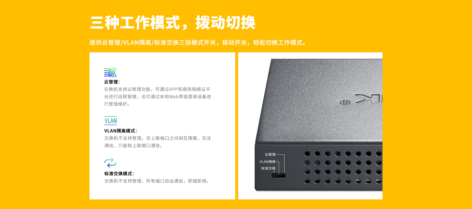 支持云管理、VLAN隔离、标准交换三种工作模式