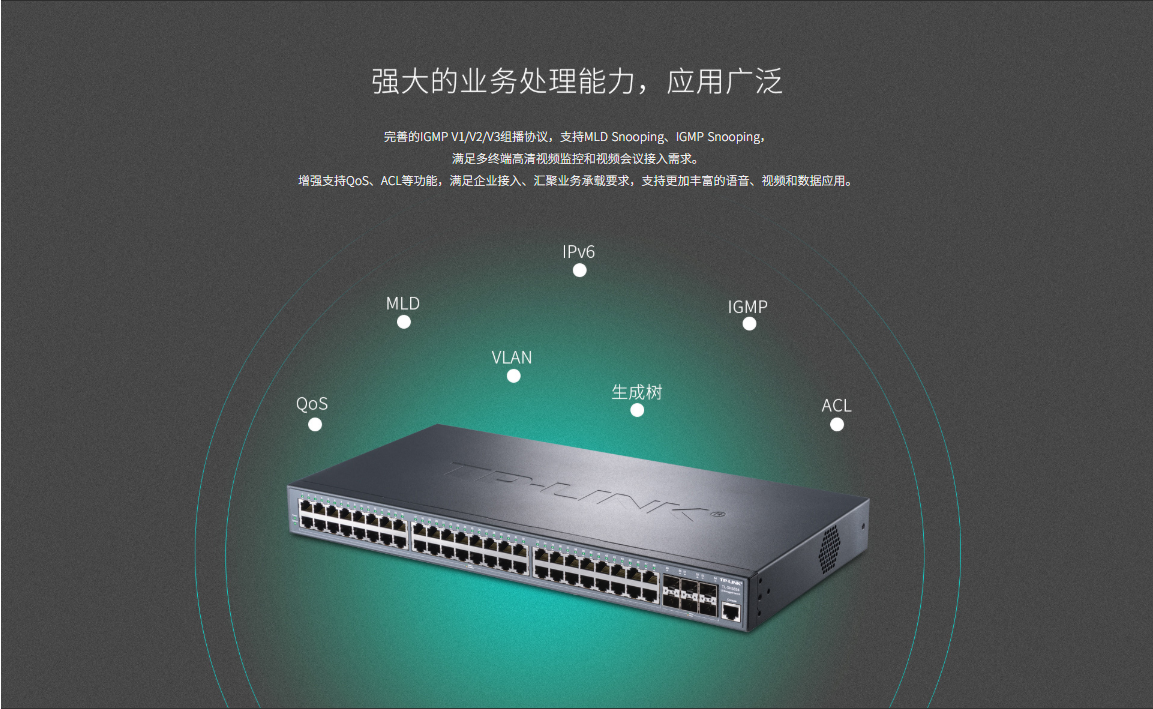 支持VLAN、QoS、ACL、生成树、组播、IPv6