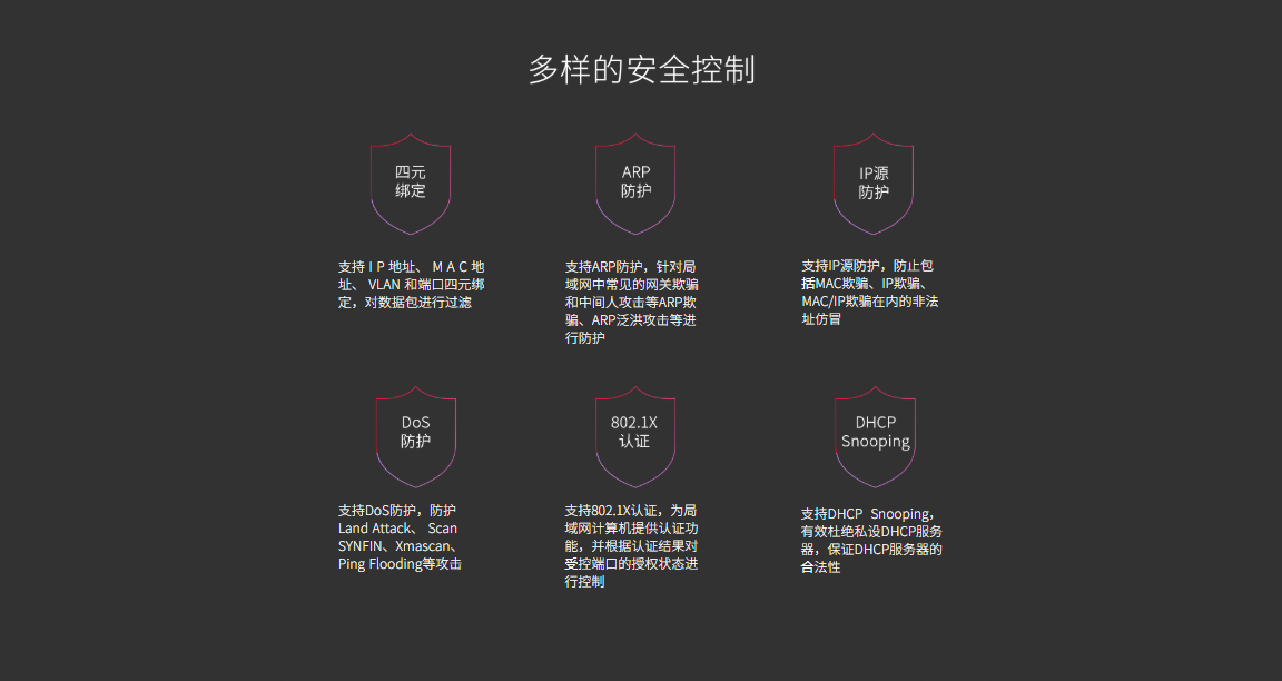 支持四元绑定、ARP/IP/DoS防护、802.1X认证