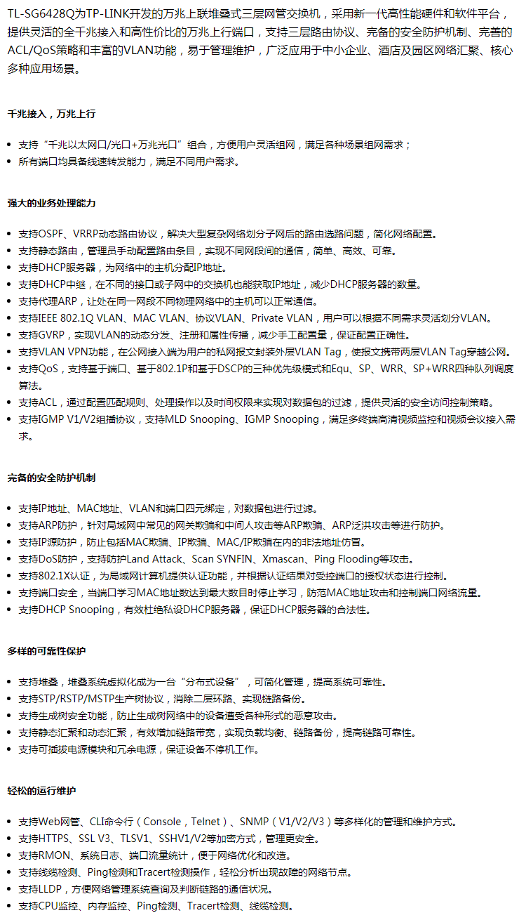 万兆上联堆叠式三层网管交换机 24个10/100/1000M自适应RJ45端口+4个复用千兆SFP光纤模块扩展插槽+2个独立万兆SFP+光纤模块扩展插槽+1个接口模块扩展卡插槽(可扩展2个万兆SFP+光纤模块扩展插槽) 支持静态路由、RIP/OSPF/PIM/VRRP等丰富的三层路由功能 丰富的端口管理功能、完备的安全防护策略 完善的ACL访问控制策略、强大的QoS能力 丰富的VLAN特性、标准的集群管理功能 可支持多达8个堆叠单元 可插拔电源模块和冗余电源设计保证设备不停机工作