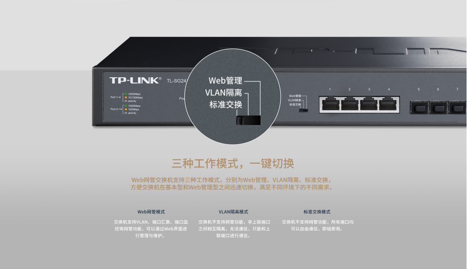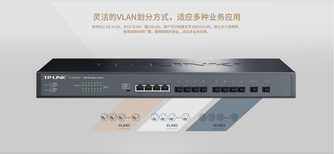 支持802.1Q VLAN、MTU VLAN、端口VLAN