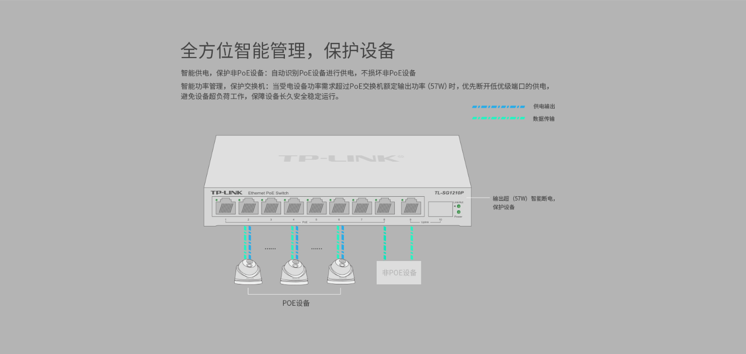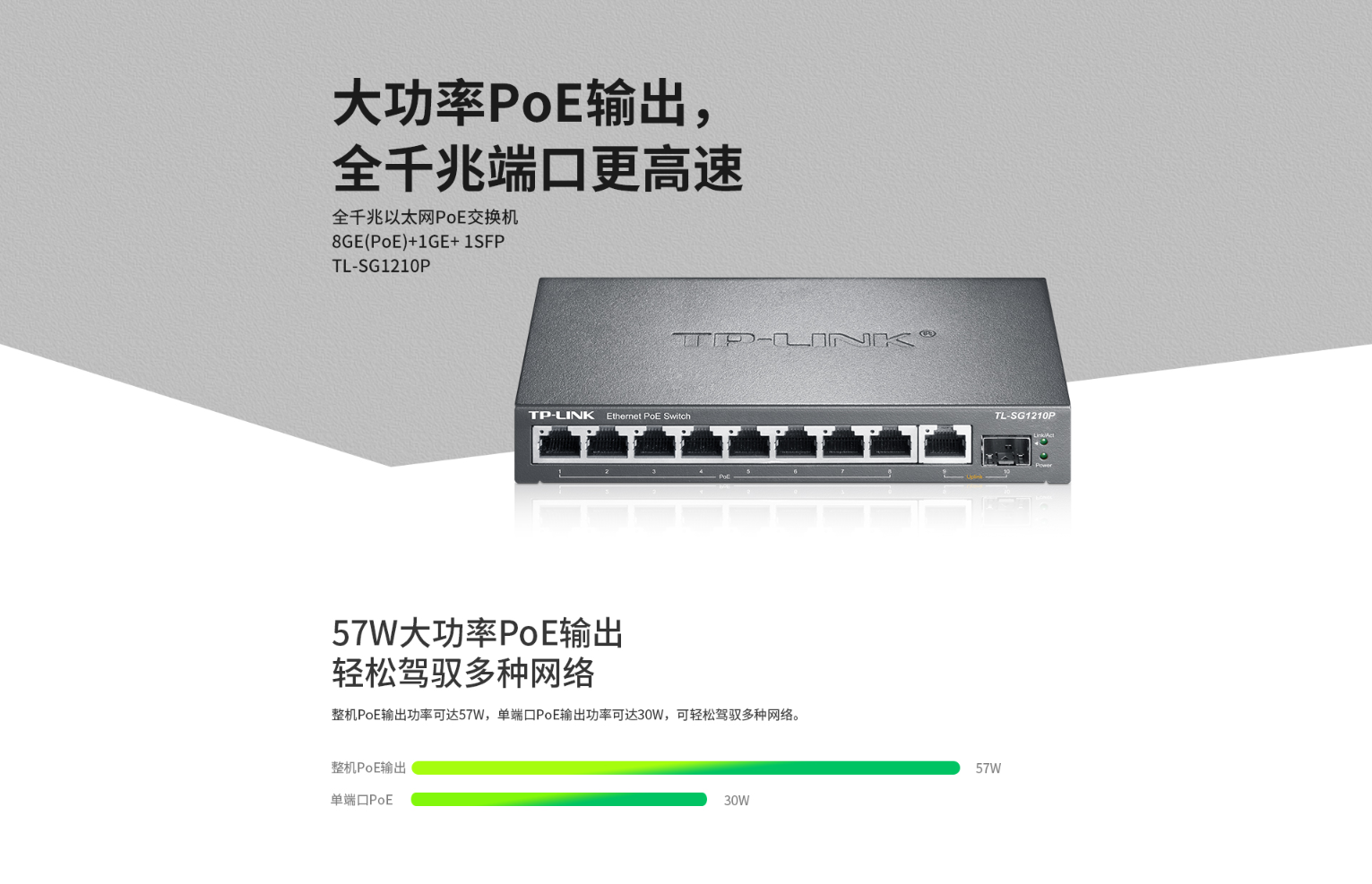 整机最大PoE供电功率达57W,单端口最大PoE供电功率为30W