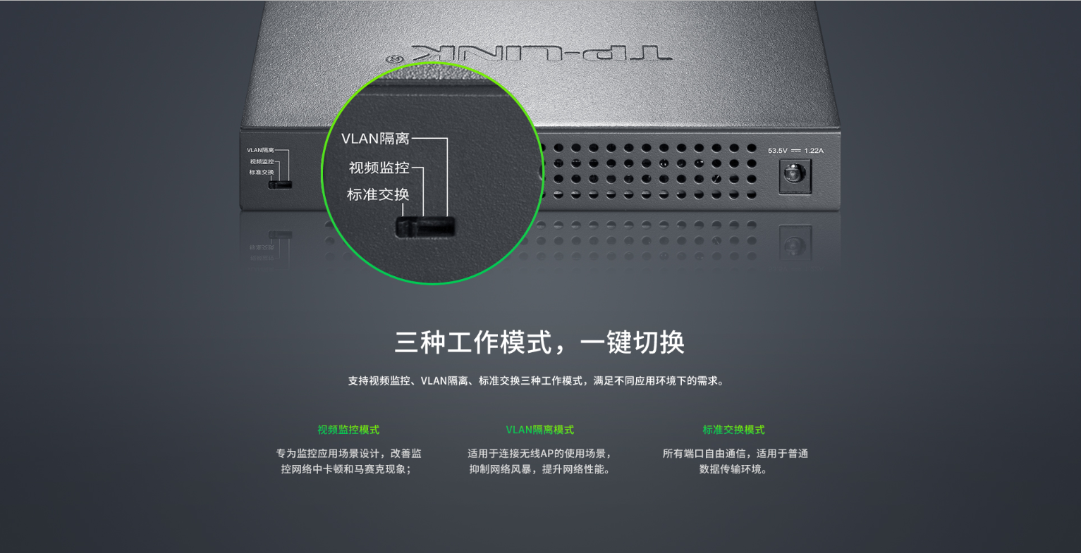 支持视频监控、VLAN隔离、标准交换三种工作模式制