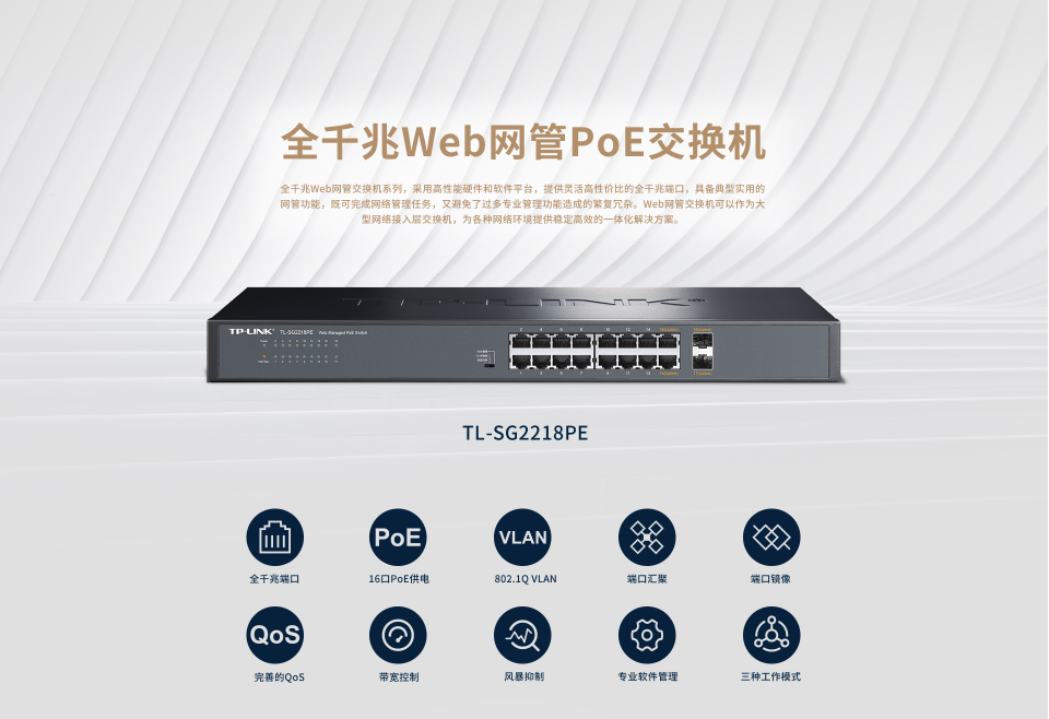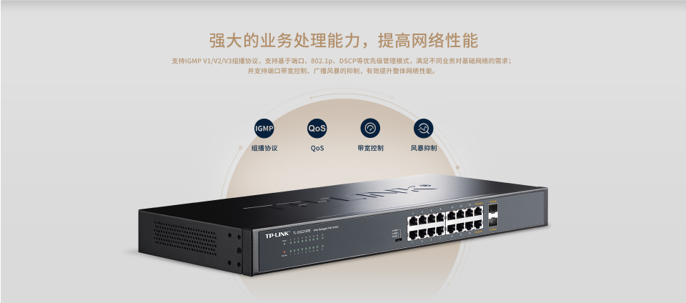 支持802.1Q VLAN、Port VLAN、QoS、带宽控制、风暴抑制