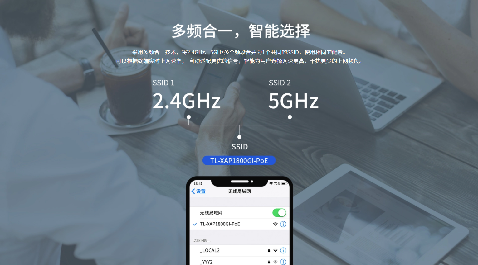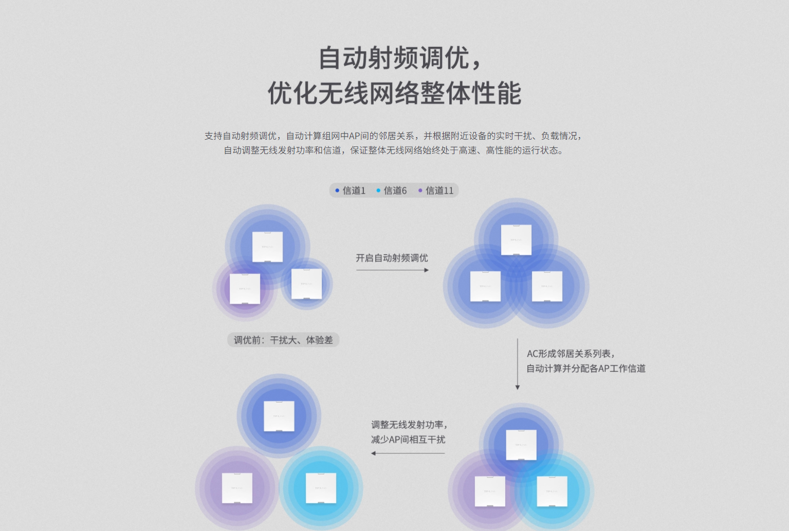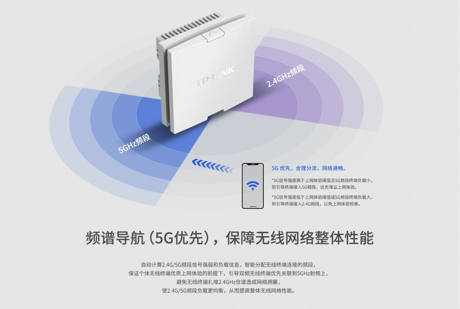 频谱导航,引导双频客户端优先连接到5GHz 频段上,使2.4GHz 和5GHz 两个频段负载更均衡,保障网络性能
