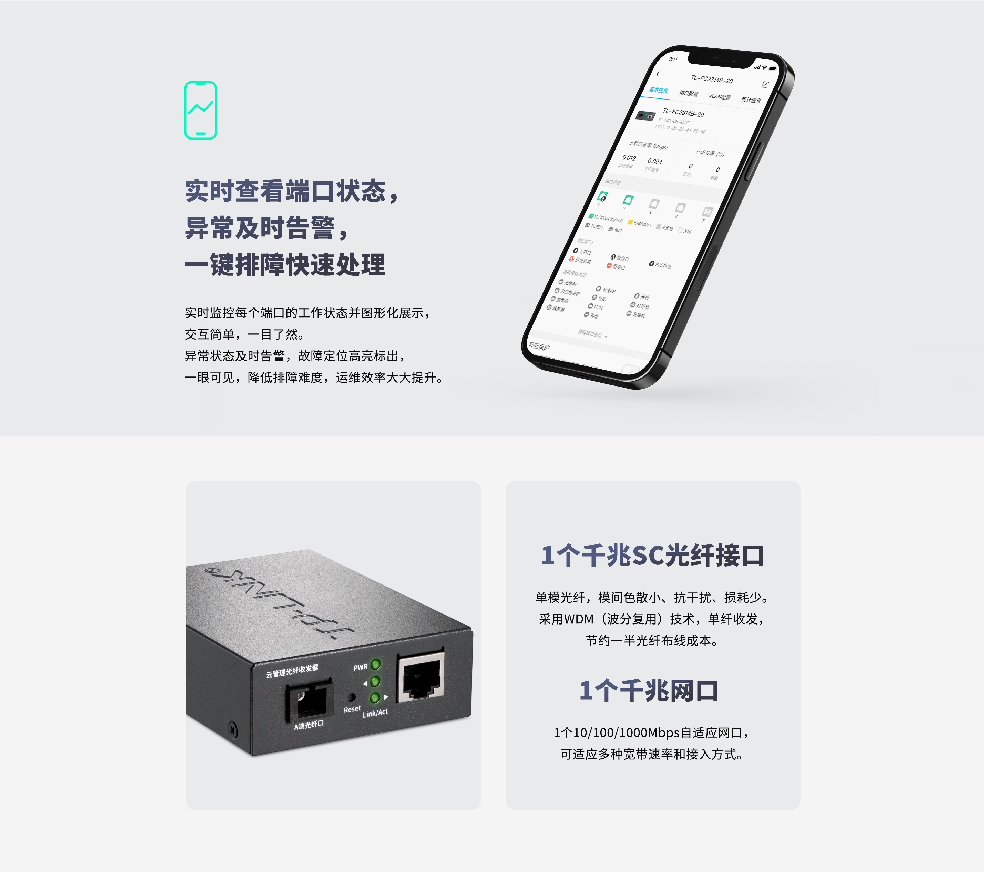 1个100/1000Mbps SC光纤口,1个10/100/1000Mbps RJ45网口