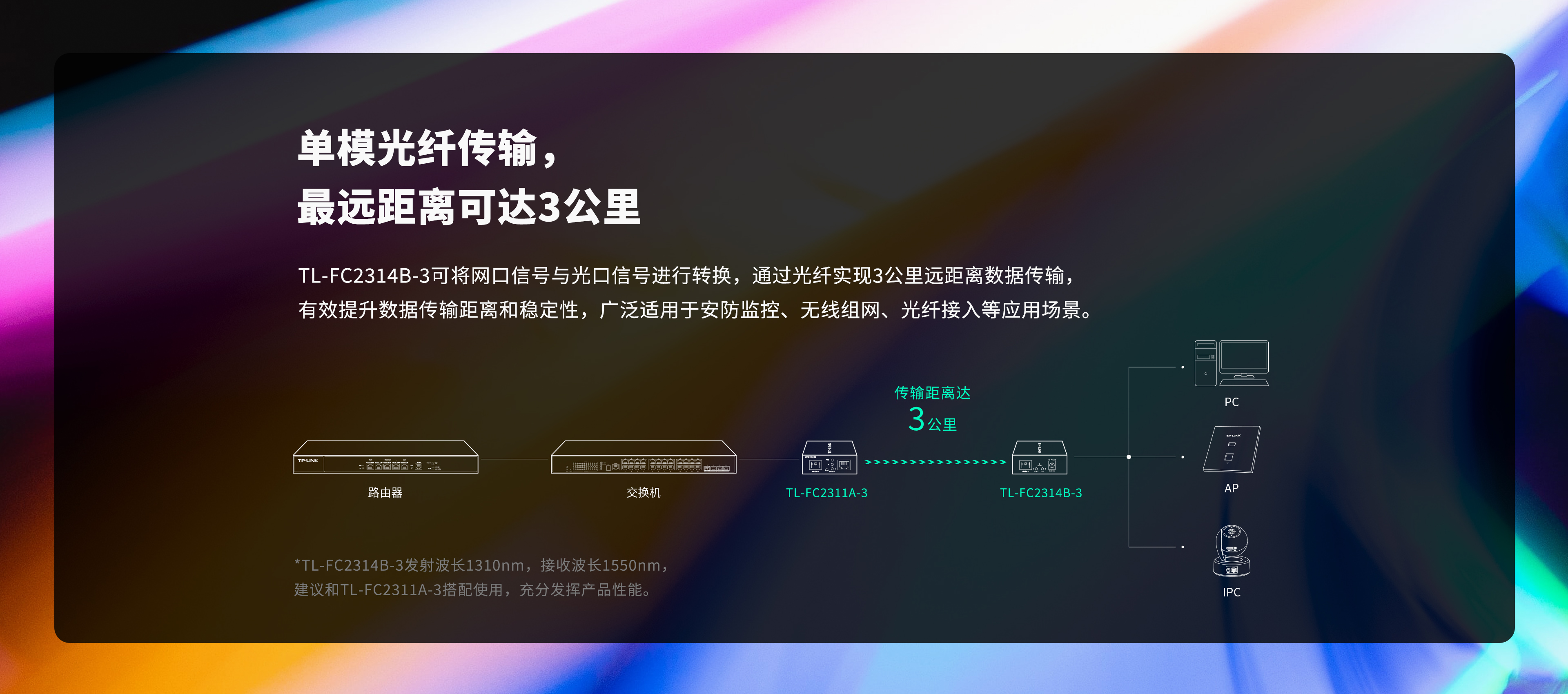 基于波分复用技术(发射波长1310nm、接收波长1550nm),单模单纤传输,最远距离可达3公里