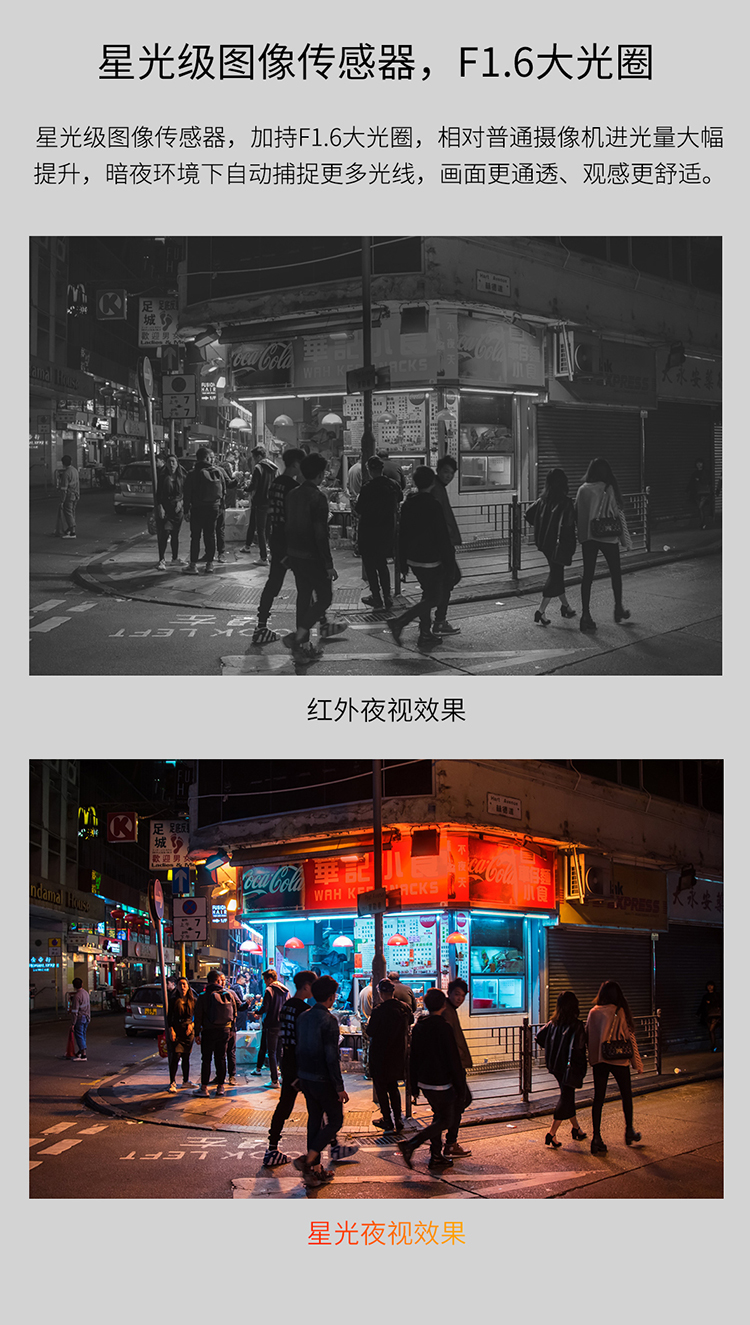 采用星光级CMOS图像传感器和F1.6大光圈镜头,图像清晰画质高