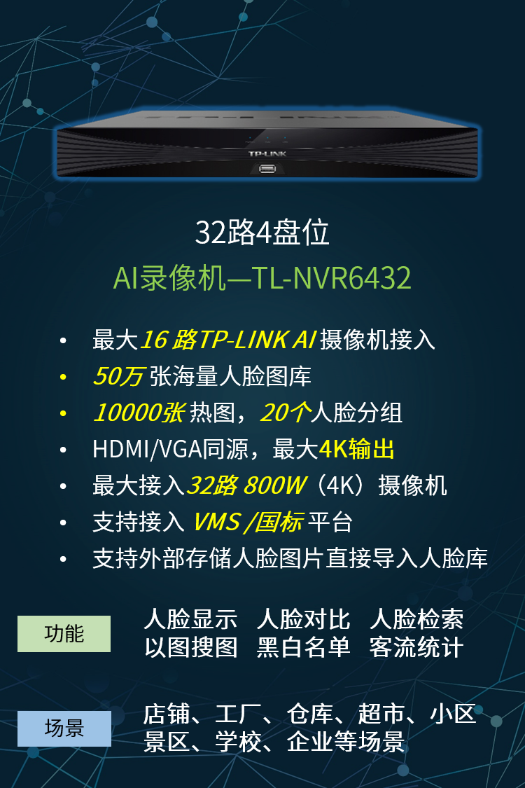 32路4盘位录像机TL-NVR6432全新升级啦!新上市的TL-NVR6432 V3.0增加了丰富的AI功能、云录像机、弹性路数。单台录像机最大接入16路AI摄像机,同时完成人脸抓拍、人脸库管理、黑白名单策略和客流统计功能。完美实现工程商和用户朋友们追求的:功能完备、高效交付、极致体验。