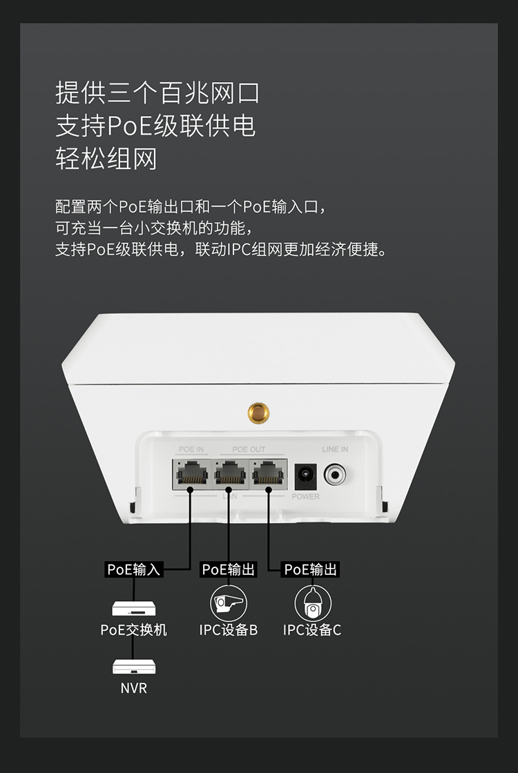 支持PoE级联,最多可为后端2台设备解决网络和供电问题