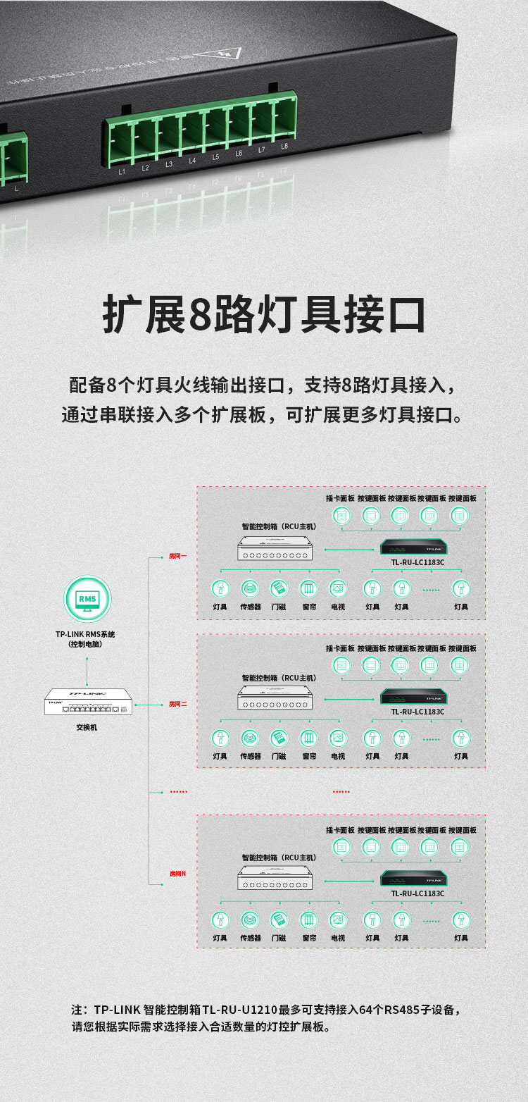 • 单台扩展板最高支持8路灯具接入