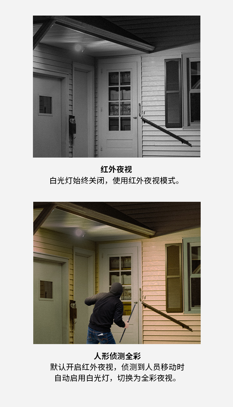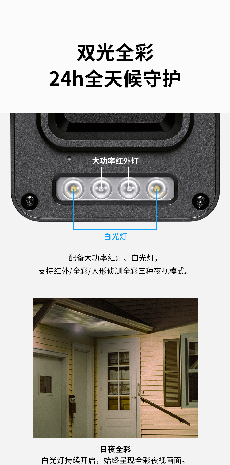 外置2颗暖光灯、2颗红外灯,支持全彩/红外/移动侦测全彩