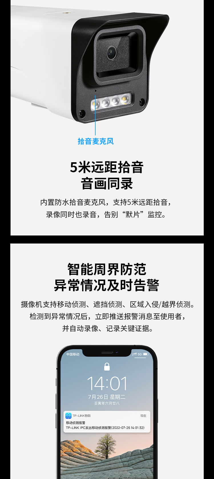 内置麦克风,支持5米拾音 支持5项事件侦测:移动侦测、遮挡侦测、区域入侵侦测、越界侦测、异常侦测