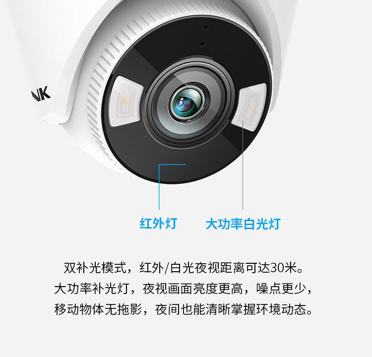 外置2颗暖光灯、2颗红外灯,支持全彩/红外/移动侦测全彩