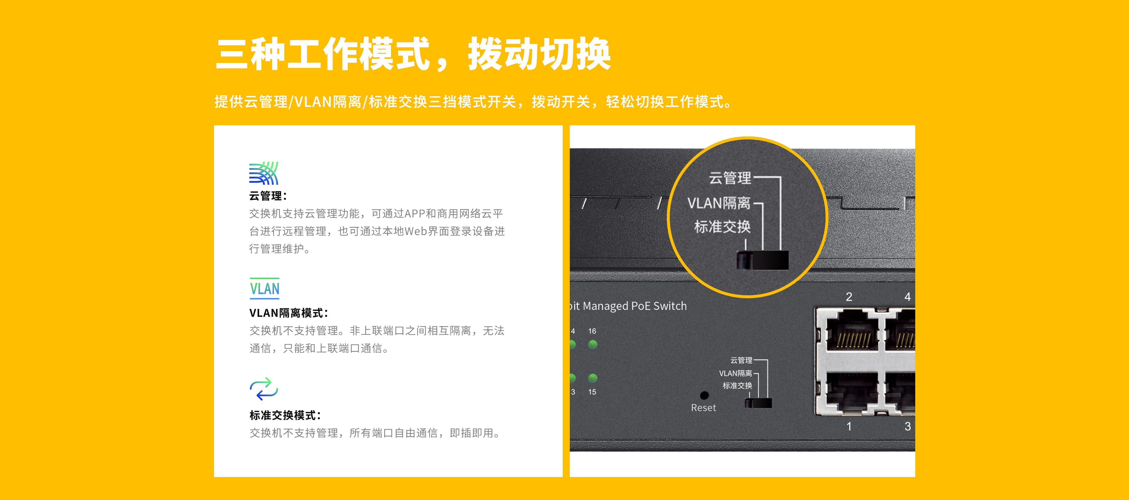 • 支持云管理、VLAN隔离、标准交换三种工作模式