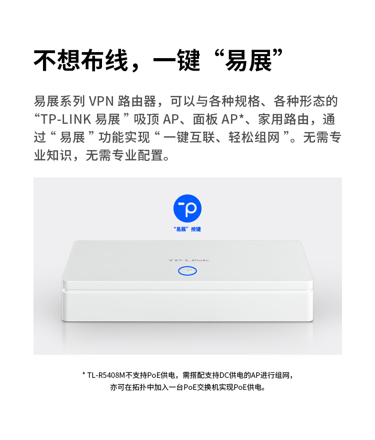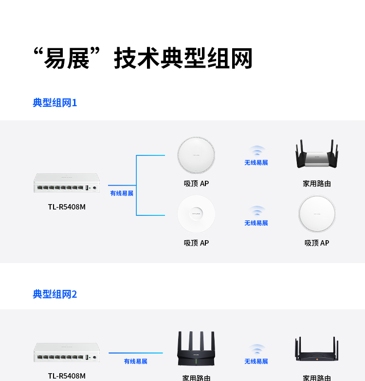 • 支持易展组网,可与易展系列企业无线路由、AP、家用路由便携组网