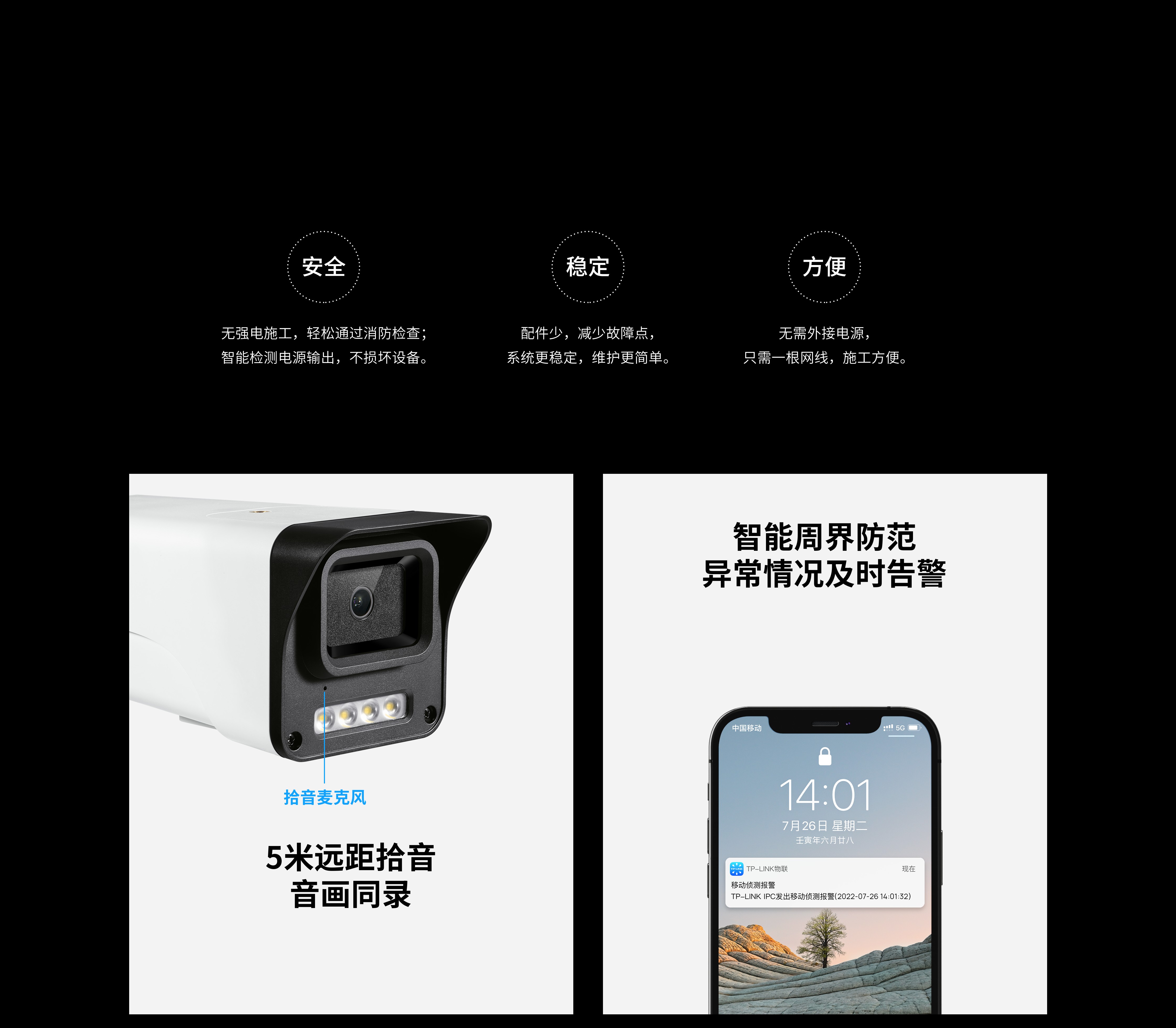 支持移动侦测、遮挡侦测、区域入侵侦测、越界侦测等