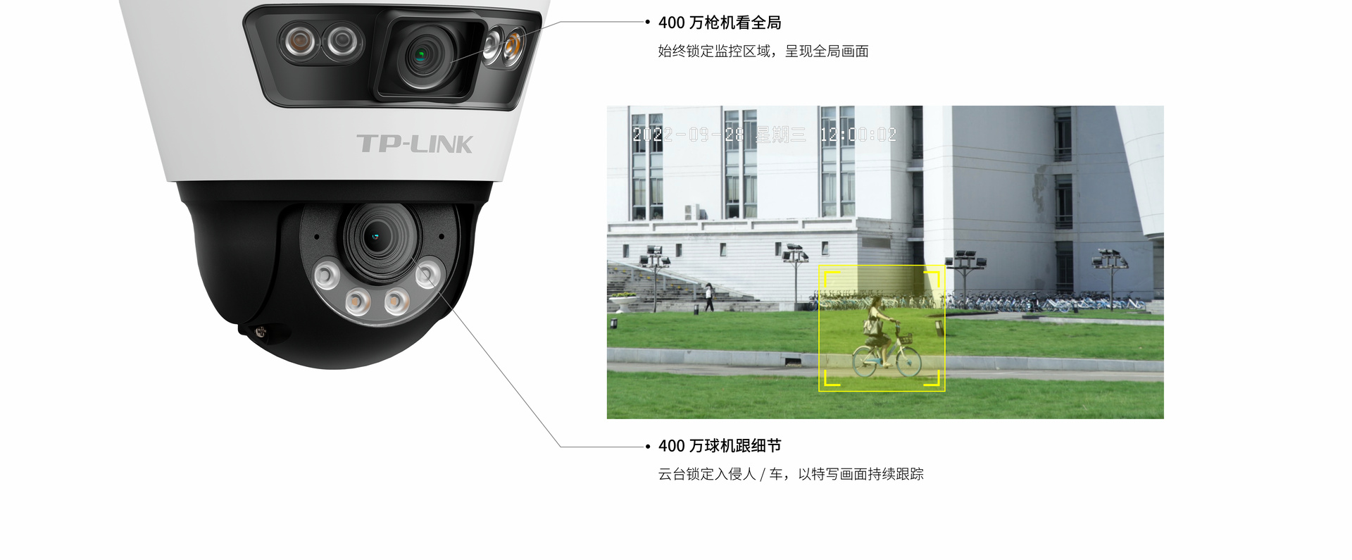 枪球联动,400万像素枪机+400万像素球机,兼顾全景画面与特写画面
