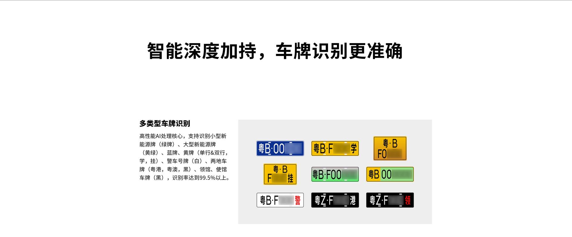 采用高性能AI芯片,支持智能抓拍识别车牌,综合识别率≥99%