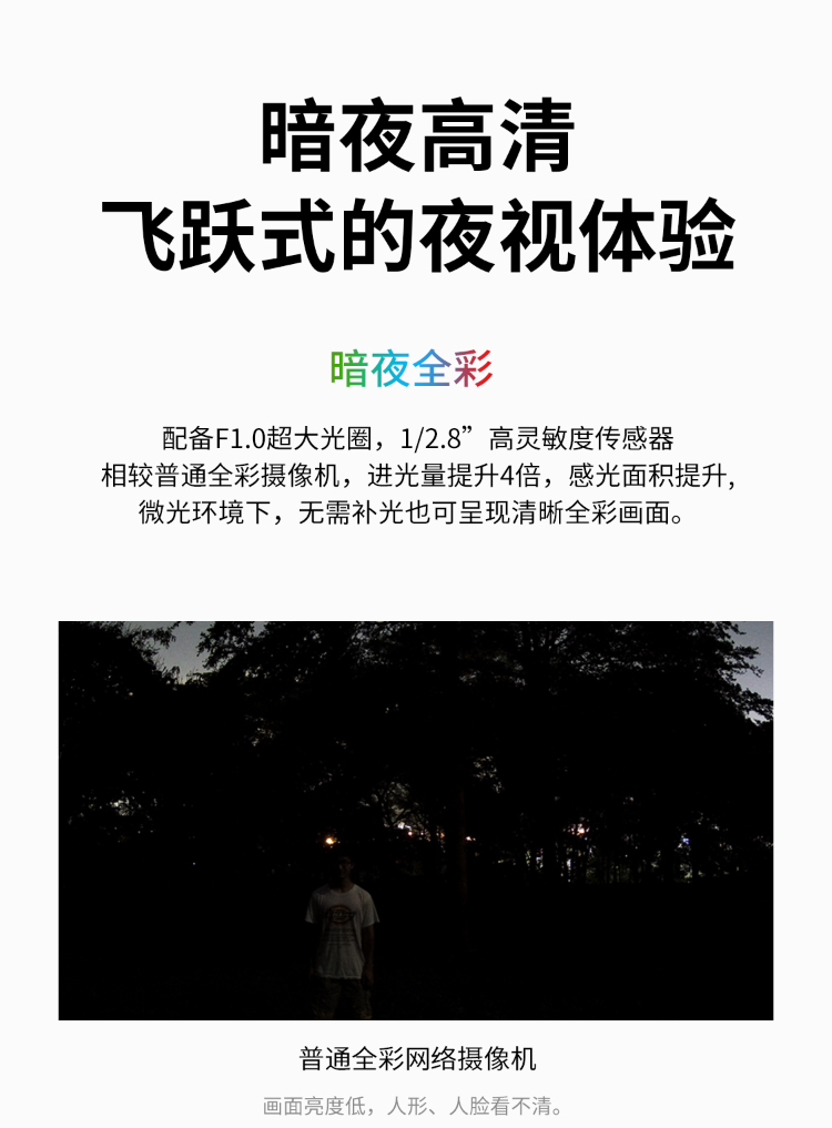 采用大靶面高感光Sensor,F1.0大光圈镜头,极低照度仍然保持全彩