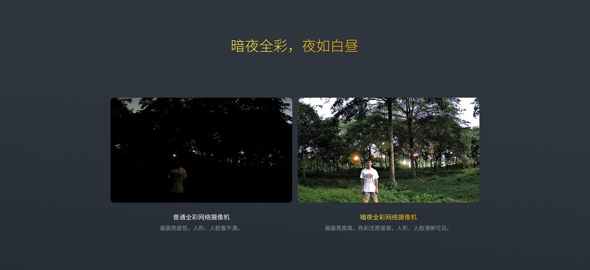采用黑光级图像传感器、F1.0大光圈镜头,极低照度下依然保持彩色画面