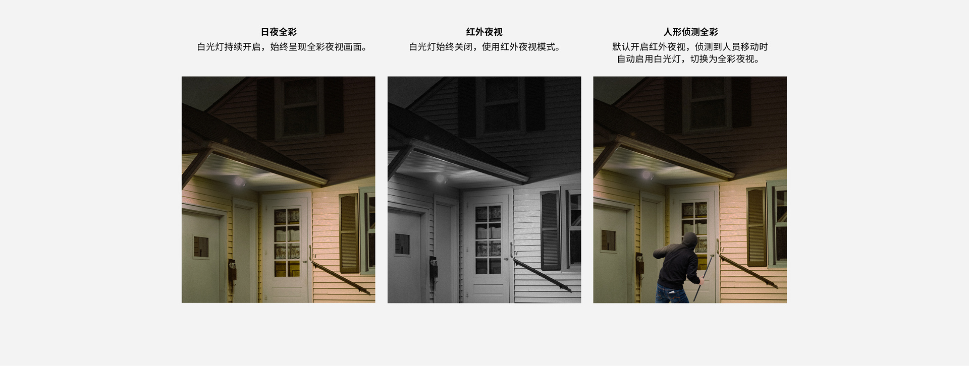 外置2颗暖光灯、2颗红外灯,支持全彩/红外/移动侦测全彩
