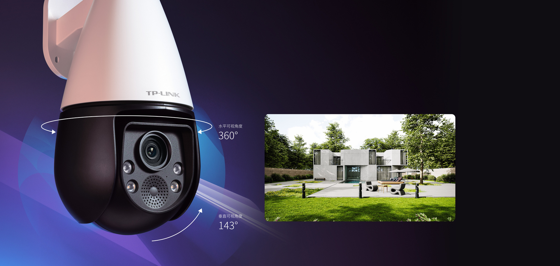 云台转动,水平可视角度360°,垂直可视角度143°